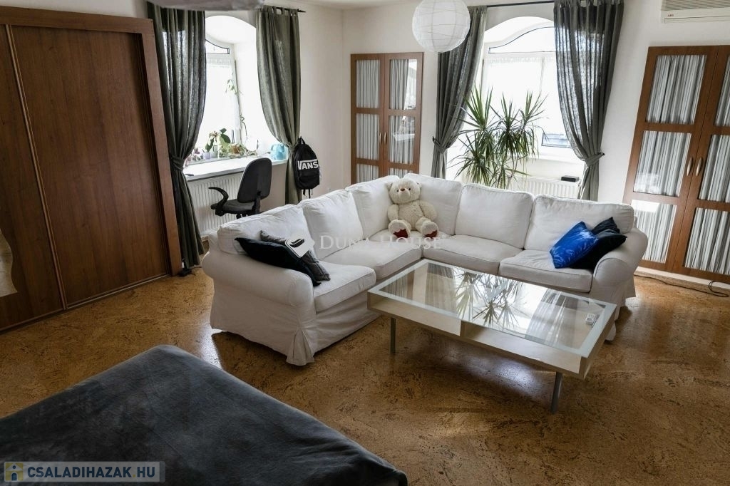 Dunakeszi központi részén, csendes, rendezett utcában elhelyezkedő elegáns, nagy terekkel rendelkező, két generáció részére is alkalmas 224nm-es családi ház eladó.