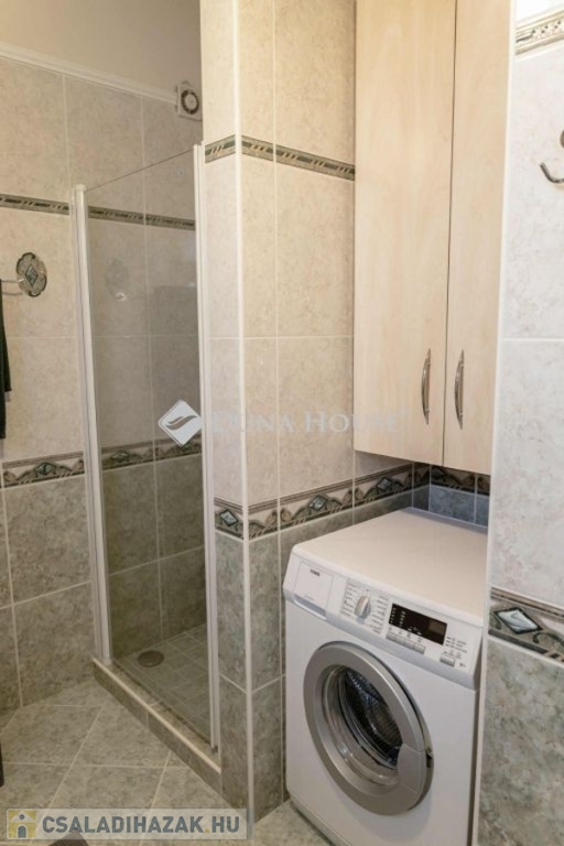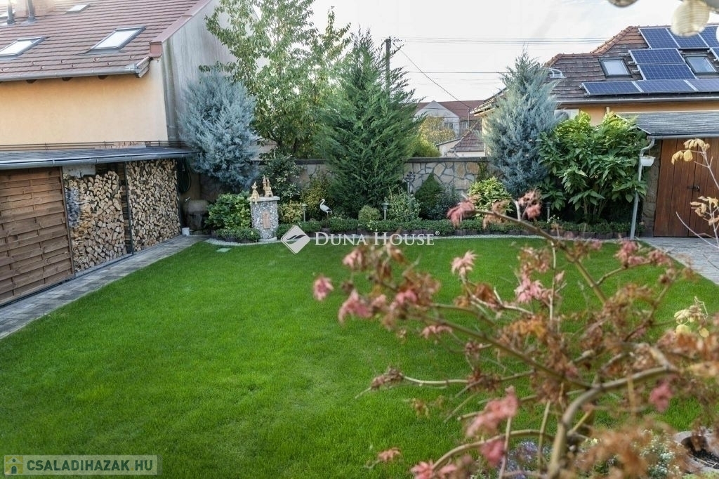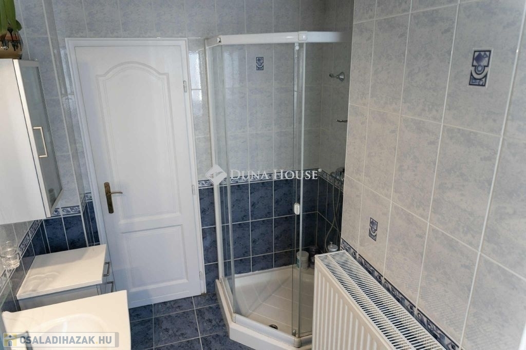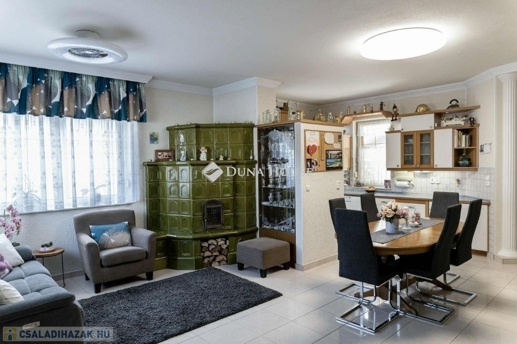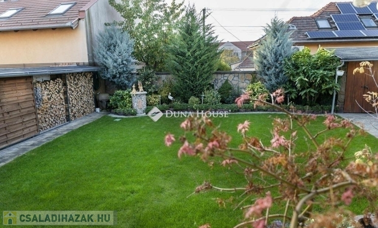 A nappaliban beépített gyönyörü cserépkályha mellett élvezhetjük a téli estéket. A konyha beépített, gépesített konyhabútorral. A földszinti hálószobából gardróbszoba és fürdőszoba nyílik. A ház alatt a földszintről megközelíthető 12 nm-es pince található. A házból nyílik az egy kocsi beállós garázs. A kertben fedett kocsibeálló is található, ami az elektromos kapun keresztül közelíthető meg. Az emeleten két szoba, beépített gardróbszekrényekkel, nappali és fürdőszoba található. A kert gondozott, ápolt pázsittal, nővényekkel, grill sarokkal és dézsafürdővel, valamint háromrészes tárolóval, a bejárat előtt hangulatos, fedett nagy terasszal.