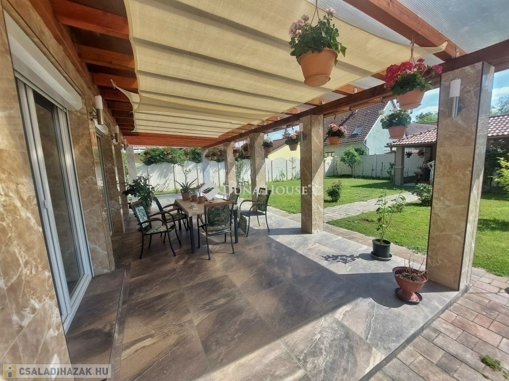 A lakótérről: 150 m2, mely 3 tágas szobából, fürdőszoba, kamra, háztartási helység, wc és egy hatalmas amerikai-konyha nappaliból (50 m2) áll. A ház 2020-ban épült MINŐSÉGI KIVITELEZÉSSEL, PRÉMIUM ANYAGOKBÓL készült (körbejárható) elő-és hátsókertes. A nappaliból kilépve egy gyönyörű, beépített, fedett teraszon találjunk magunkat, mely lehetőséget ad számos baráti és családi összejövetelekre. Az ingatlan 800m2-es parkosított telken fekszik, melynek végében egy szintén minőségi kivitelezéssel készült 12 m2-es „nyári konyha”+27 m2-es terasz került kialakításra, csatlakozva a 25m2-es garázshoz. (Az ingatlan ezen részén akár egy önálló lakrész is kialakítható ha esetleg a beköltöző család létszáma ezt igényelné.)