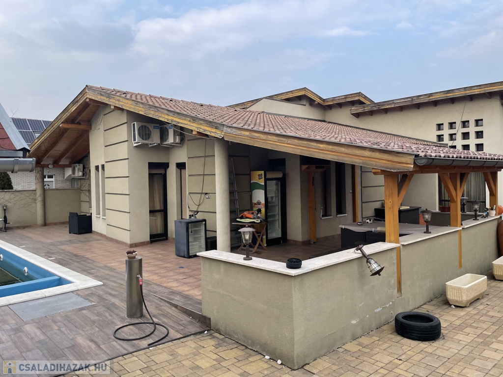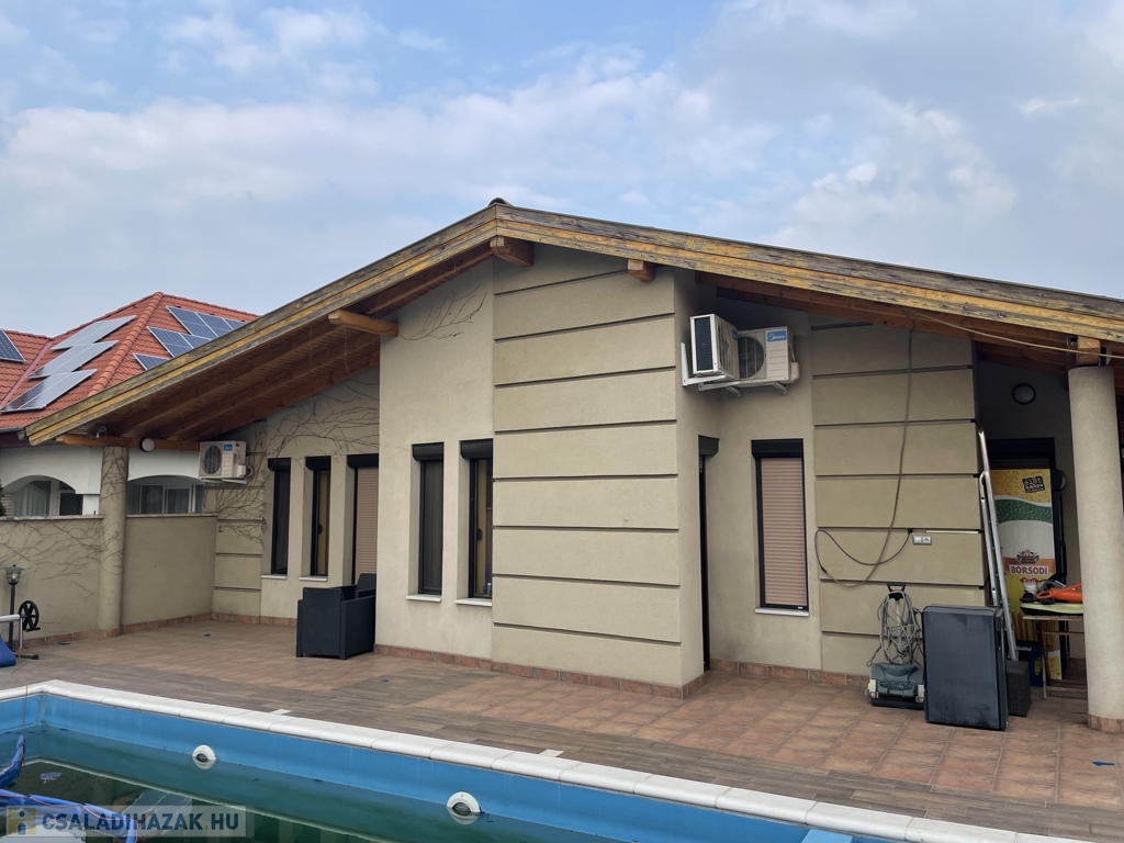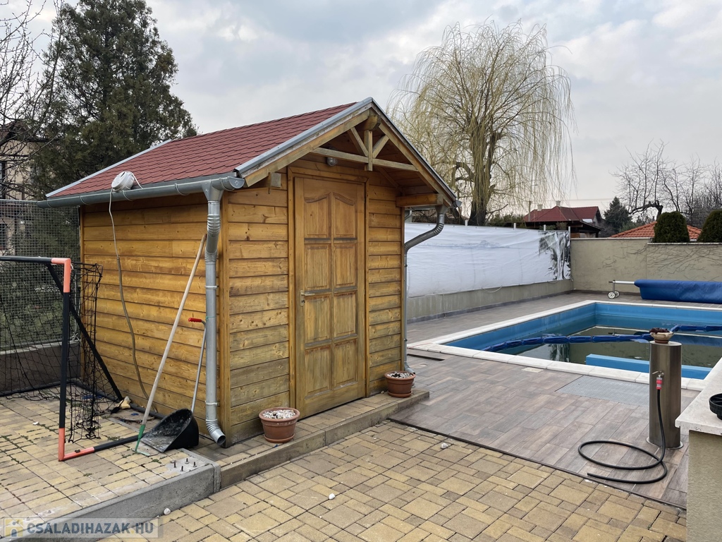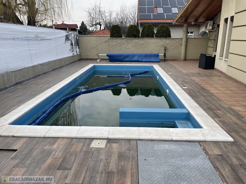 Az udvar a bejárattól a hátsó részig, ahol egy 8,5 méter X 4,0 méter-es teljes gépészettel ellátott medence is található végig térkövezve van!