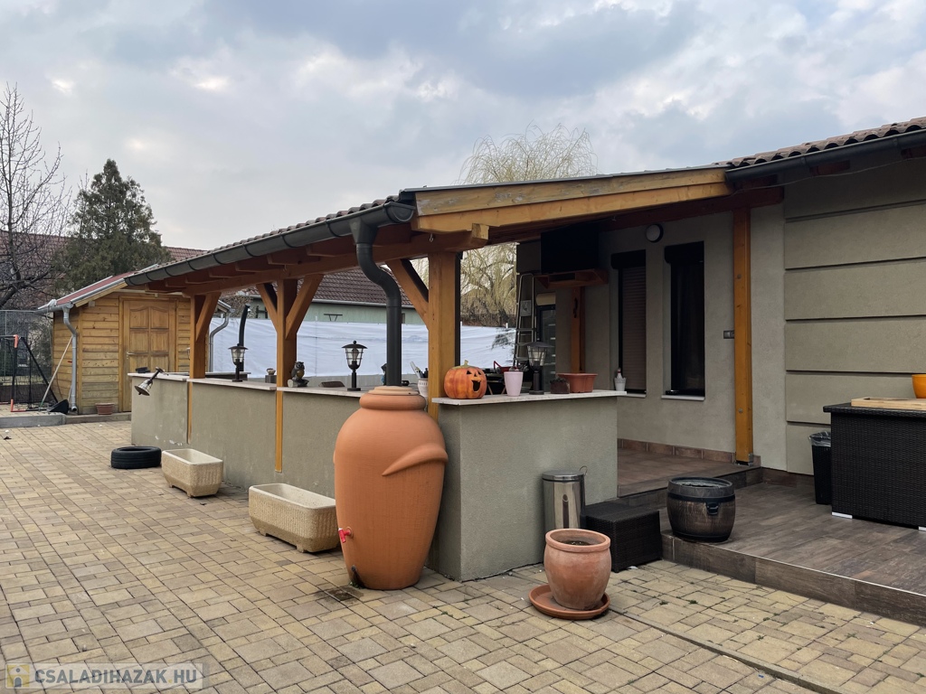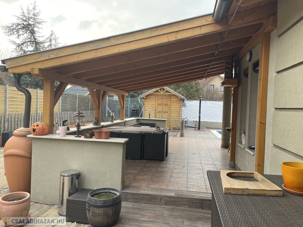A fedett terasz 90 m2, mely járólapozva van, kiváló kialakítással rendelkezik.