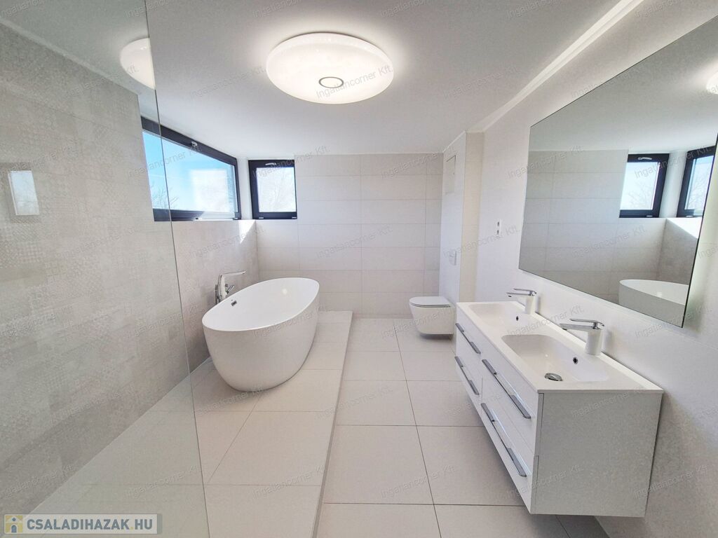 2. emeleten: egy úgyszintén nagyméretű hálószoba a hozzá tartozó FEDETT terasszal, és a szobából nyíló WELLIS szaniterekkel felszerelt nagyméretű, ablakos fürdőszoba: ahol WELLIS OVAL kád, üvegfallal ellátott épített zuhanyzó, duplamosdó a hozzá tartozó mosdószekrénnyel, wc-vel.