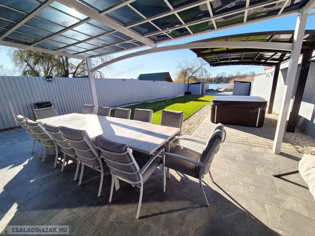 A teraszról könnyen elérhető a képen látható térkövezett, fedett részen egy szinte új, 4 személyes JAKUZZI mely megvásárolható,de a vételárat nem tartalmazza.
