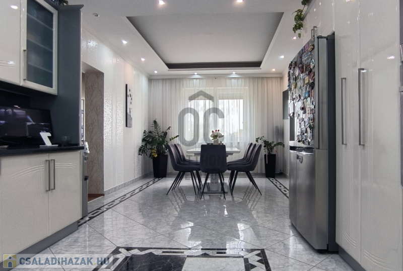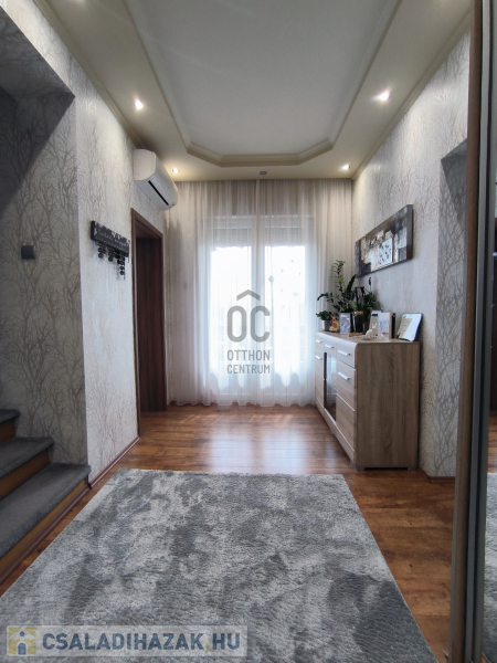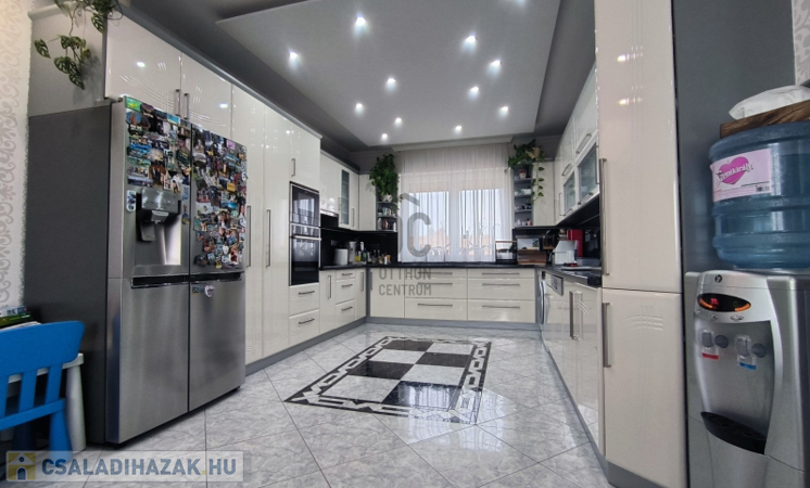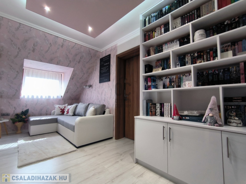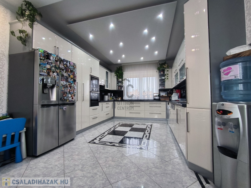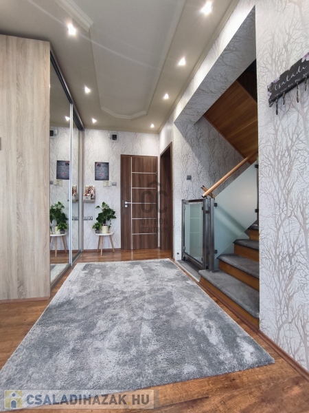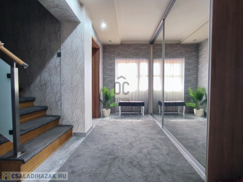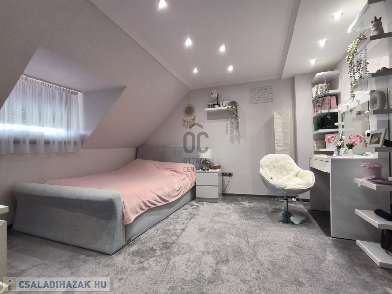A házban 5 tágas szoba található, amelyek világosak és barátságosak, emellett két modern fürdőszoba is rendelkezésre áll, ami a nagycsaládosok kényelmét szolgálja. A konyha és az étkező egy légtérben van, így családi és baráti összejövetelekre is kiválóan alkalmas. 2 szobához gardrób helyiség lett kialakítva, ami a hölgyek álmát valósítja meg. Az egész ingatlan az igényességet és a harmóniát árasztja, modern, fiatalos színvilággal. Korszerű energetikai berendezések, 7,5 KW-os napelem és a hozzá tartozó tárolónak, a hőszigetelésnek és köztes elhelyezkedésének köszönhetően alacsony a fenntartási költsége. A 30m2-es garázs akár 2 autó beállását is lehetővé teszi az elektromos kapukon keresztül. A házban a riasztó és-kamera rendszer is ki lett építve.