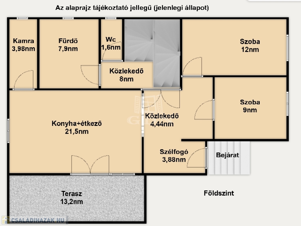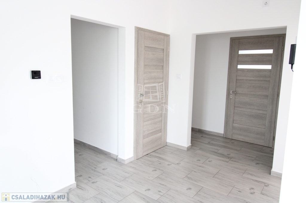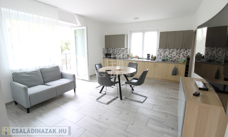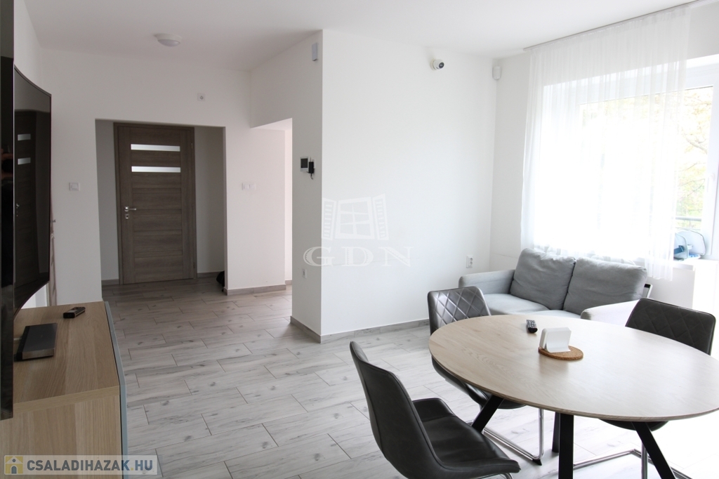 Földszintre egy 3,88nm-es szélfogón keresztül juthatunk be. Ezen a szinten 21,5nm nagyságú amerikai konyhás nappali, valamint az ehhez tartozó 3,98nm-es kamra, 24,3nm terjedelmű hatalmas világos szoba, (jelenleg ez a helység kettő egyenként 12 és 9nm-es szobára lett átalakítva) 7,9nm-es fürdőszoba, 1,6nm-es külön helyiségben kialakított WC és kézmosó, 4,4nm-es közlekedő, valamint 8nm nagyságú lépcsőház lett kialakítva. Ebből a lépcsőházból juthatunk le a szuterén részbe, illetve a felső szintre.
