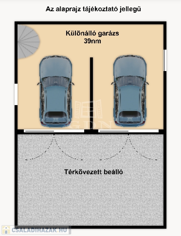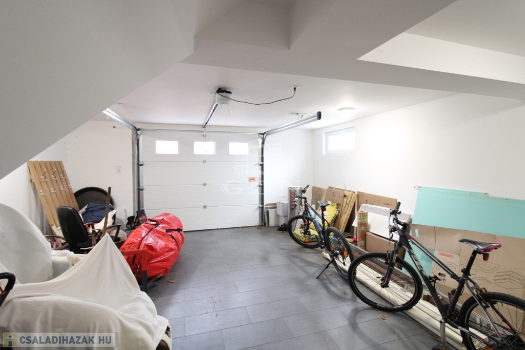 Ezen kívül a házhoz tartozik egy két gépjármű tárolására alkalmas 39nm nagyságú garázs, aminek a tetőterébe lépcsőn lehet feljutni és igény szerint a tetőtér beépíthető.