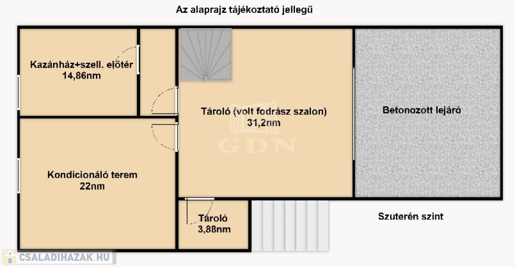 Itt egy 31,2nm garázs és 3,88nm-es tároló, 22nm nagyságú kondicionáló terem, valamint egy 14,86nm-es kazánház került kialakításra.