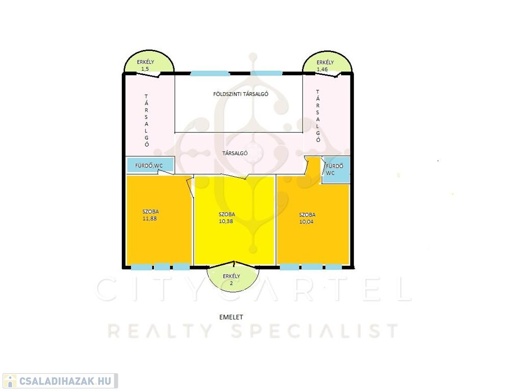 A bejárati szintről lépcső vezet föl az EMELETRE, amelynek két szélén erkélyes társalgót találunk. Az emeleten van egy kétszobás, erkélyes lakrész fürdőszobával és WC-vel valamint egy különálló szoba fürdővel és WC-vel.