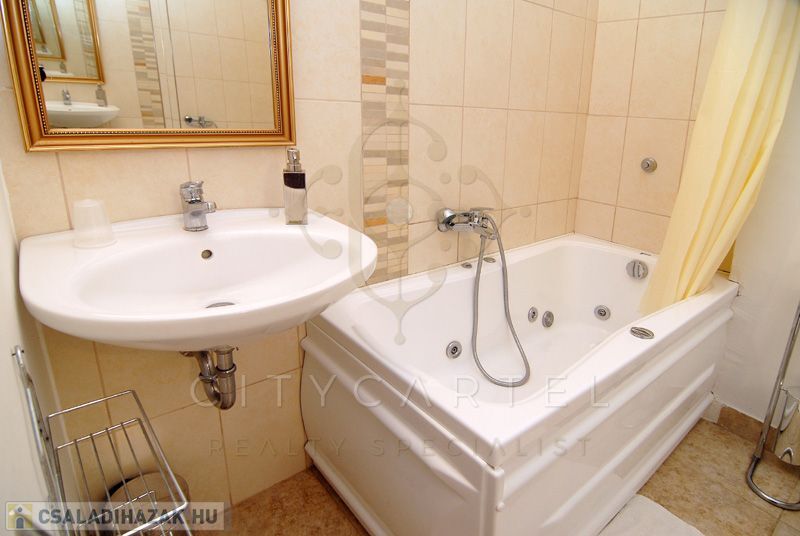 A társalgó pazar hangulatát a kandallóban lobogó tűz, a hűvösebb napokon még barátságosabbá varázsolja. Ezen a szinten van még egy külön bejáratrú szoba fürdőszobával és WC-vel. Az előtérből nyílik még egy mosdó és WC, valamint a 12 négyzetméteres közlekedő oldalánál található lépcső, amely az alsó, kerti szintre vezet továbbá egy 17 négyzetméteres szoba.