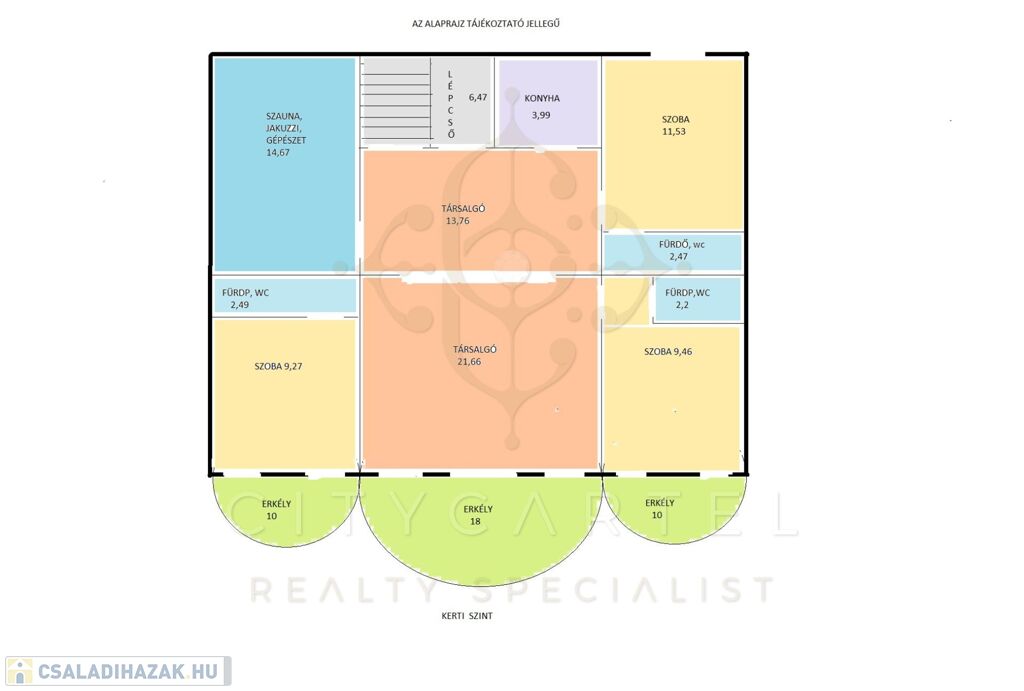 A KERTI SZINTEN a nagyméretű, erkélyes társalgóból három, külön fürdőszobával és WC-vel rendelkező, erkélyes szoba nyílik. A társalgó és a két szoba erkélyei a városra néznek. A másik társalgóból nyílik a harmadik szoba, a konyha és a wellness rész; jakuzzi, szauna, hidromasszázs kád és az ezekhez tartozó gépészet.