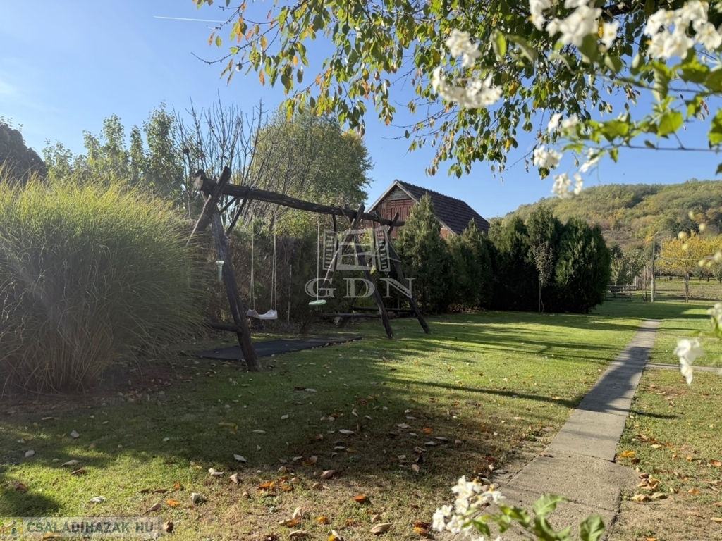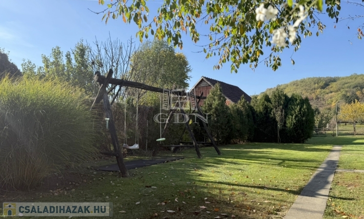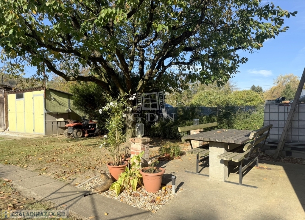 A terület cca. 800 m2, melyen szépen elkülönülnek a pihenésre és játékra szolgáló részek a veteményes és gyümölcsfák birtokától.
