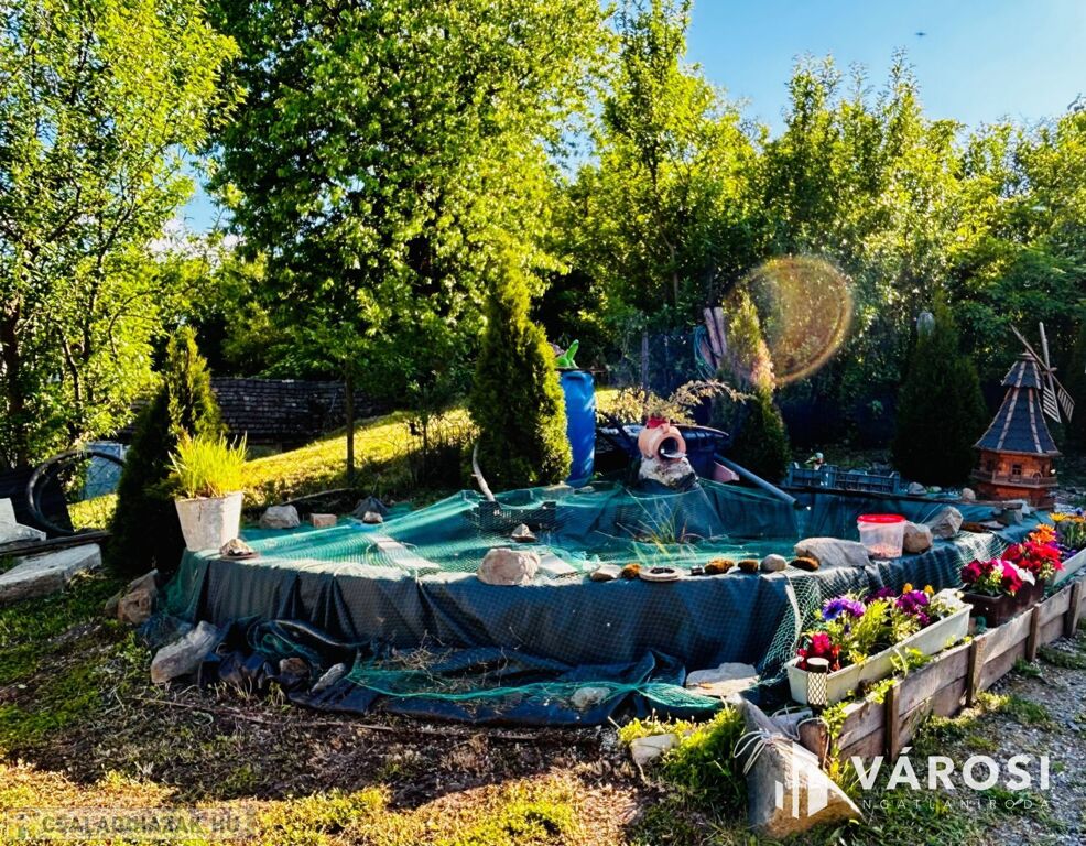 A kert 700 m2, melyben egy kerti tavacska, egy grillező-bográcsozó hely, egy fedett tároló és egy sziklakert is helyet kapott.