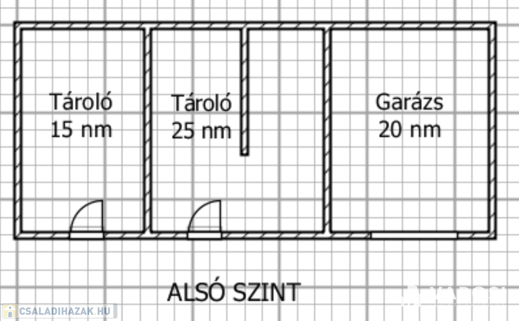Az alsó szinten 2 nagy tároló és 1 tágas garázs kapott helyet.