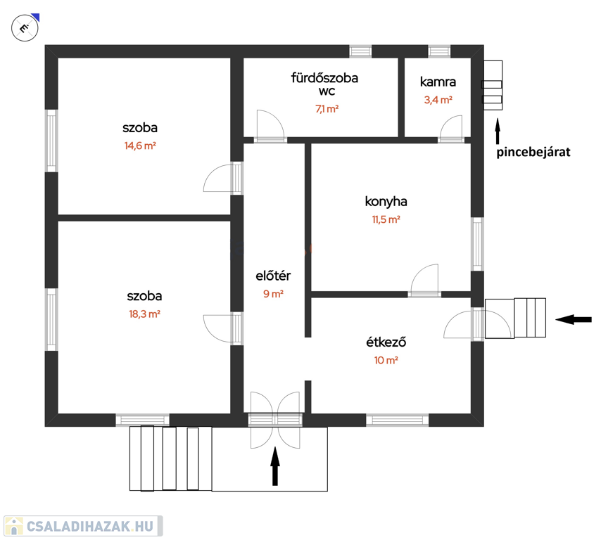 A ház két bejárattal rendelkezik, egyik a keleti, másik az északi oldalon található.