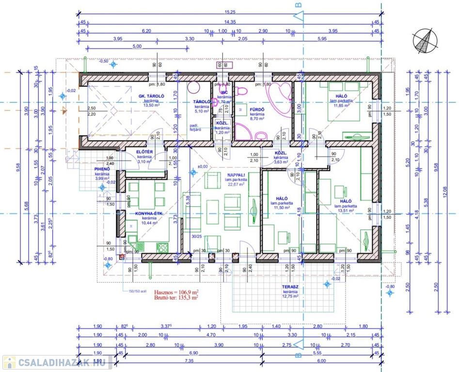 Az otthon helyiségei:amerikai konyha nappali teraszkapcsolattal 33.11 nm, szoba 13,51 nm, szoba 11,5 nm, szoba 11,85 nm, fürdőszoba 8,7 nm, előtér 3,1 nm, garázs 13,5 nm, TÁROLÓ 5,1 nm, wc 1,7 nm, terasz 12,75 nm.