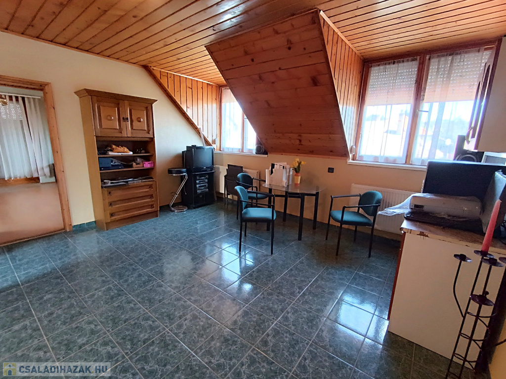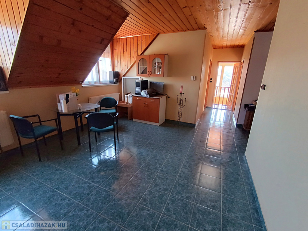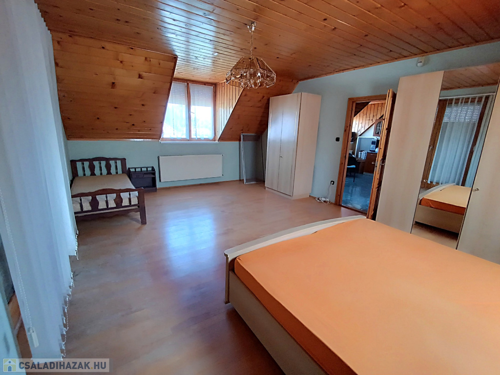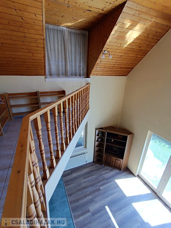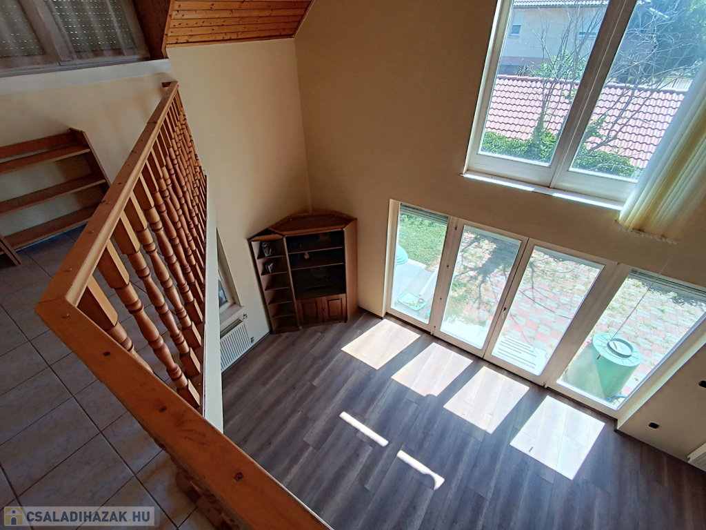 Az emeletre felérve a galériáról letekinthetsz a nappalira, ami igazán impozáns, hiszen a belmagasság itt eléri a 6 métert. Ezen a szinten egy második nappali is található konyhával, három hálószobával és egy fürdőszobával, így a fenti lakrész akár önálló lakásként is használható. A melegvíz ellátásról itt egy villanybojler gondoskodik, míg a földszinten egy kombi gázkazán biztosítja a komfortot.