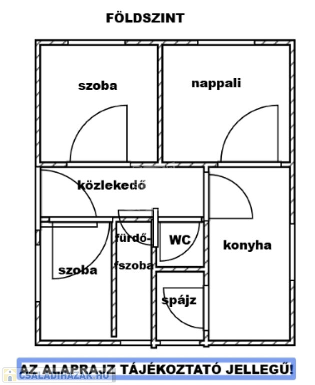 - földszint: 2 szoba, nappali, konyha, spájz, fürdőszoba, WC, közlekedő, lépcsőház,