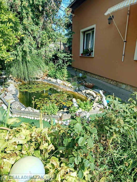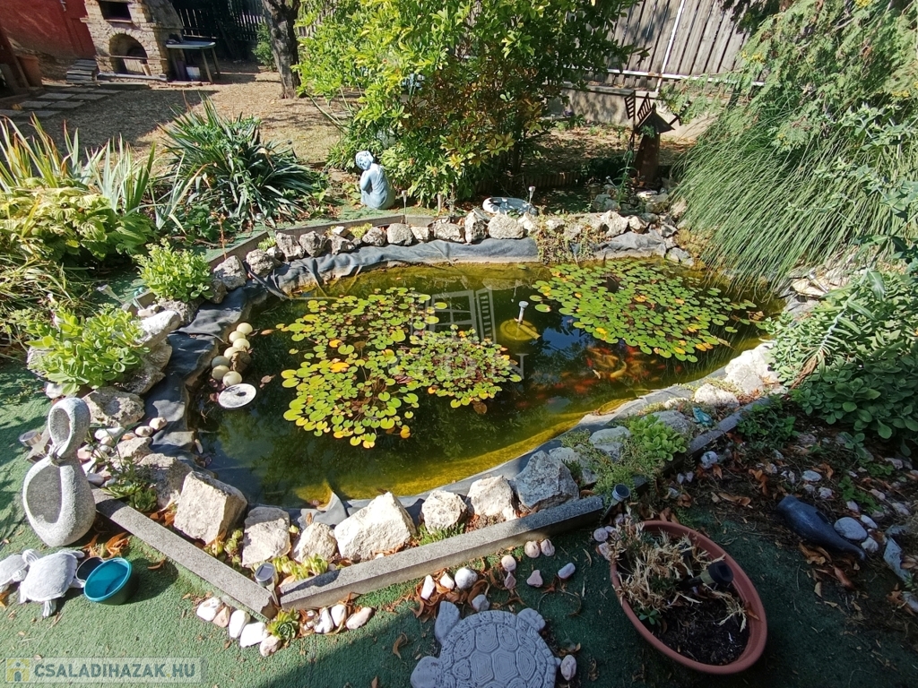 Az ingatlan egyik dísze a kis kerti tó, benne a gyönyörű színes halacskákkal.