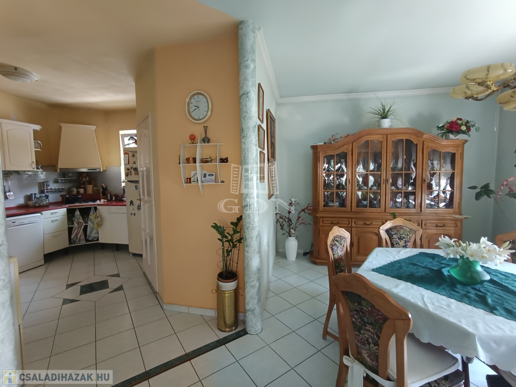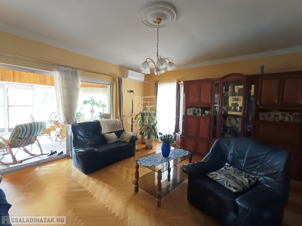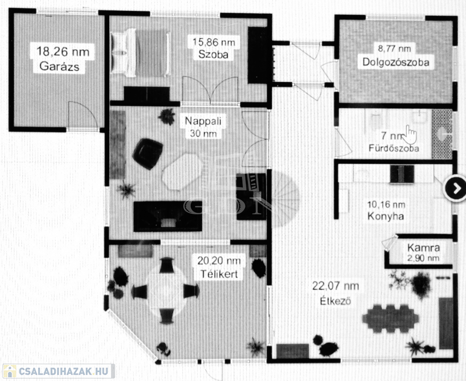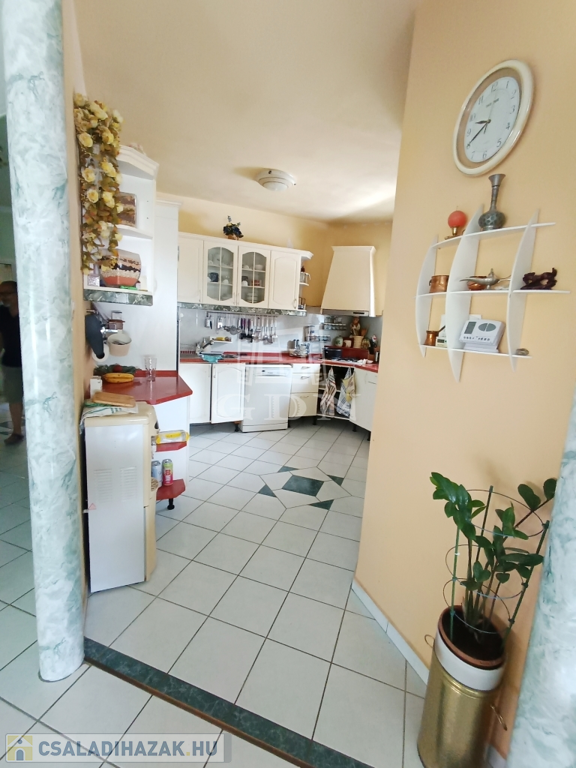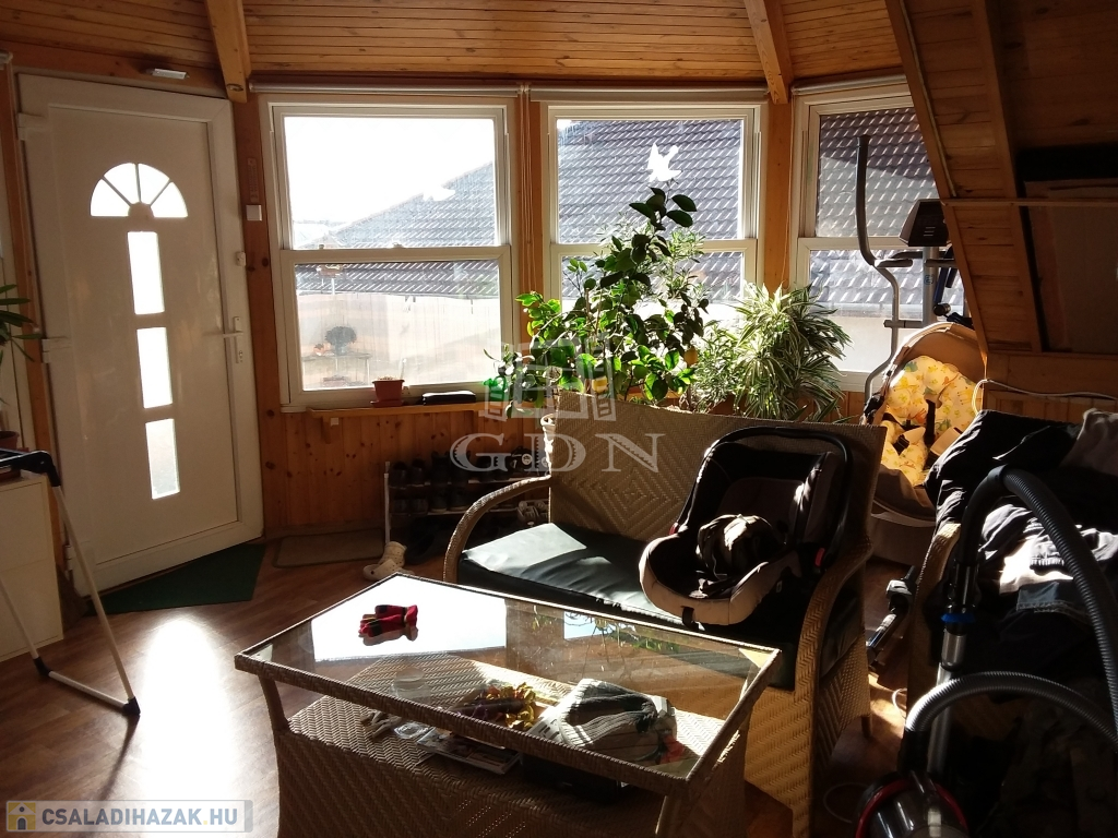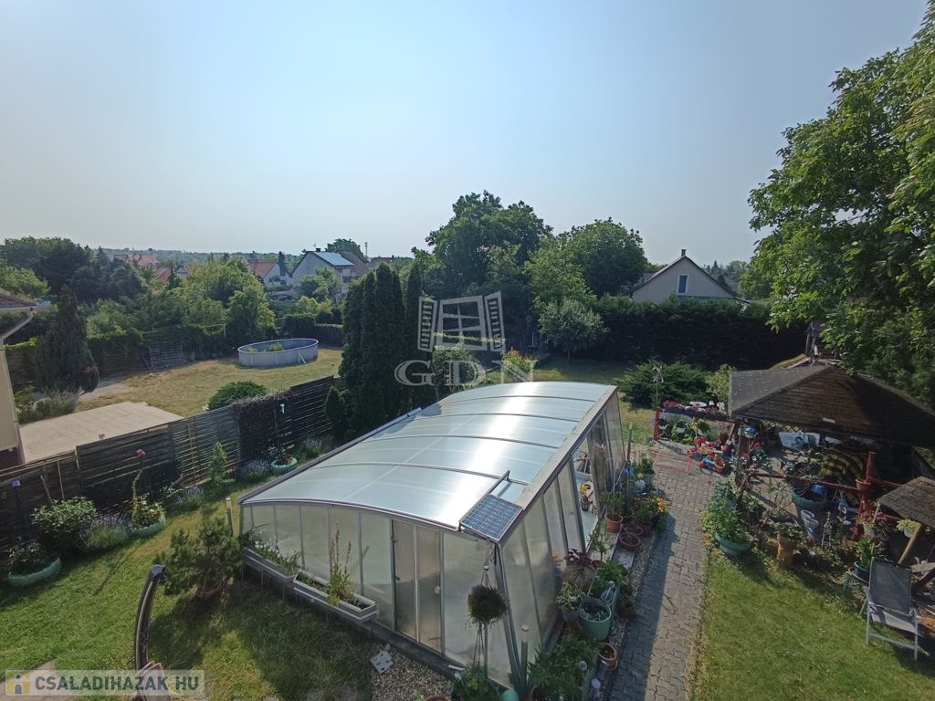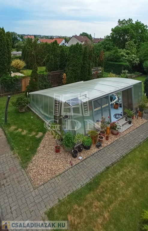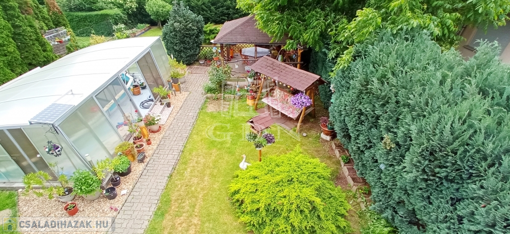 Földszint: nappali, 2 szoba, étkező, télikert, konyha, fürdőszoba, közlekedő, kamra.