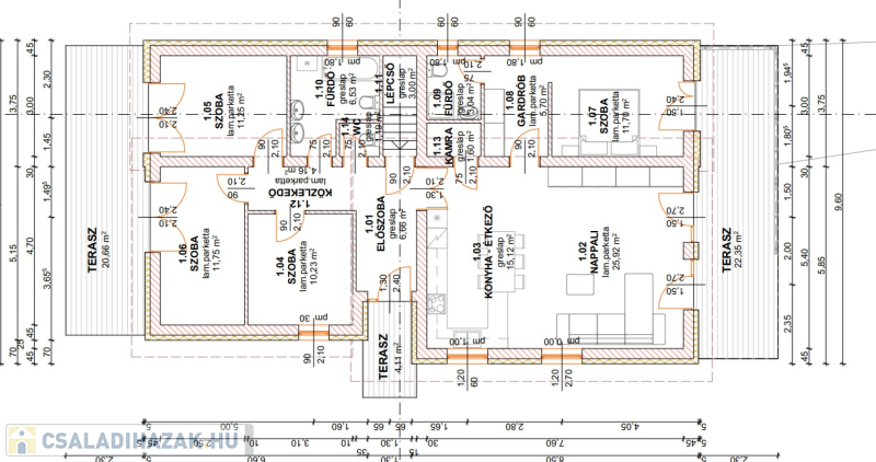 Szerkezeti leírás: Beton alap.Tégla 30-as főfalak + 15cm dryvit szigetelés. Ytong válaszfalak. A külső nyílászárók műanyag szerkezetűek. A belső nyílászárók választhatóak. A tető beton cseréppel fedett.Fűtés hőszivattyúval.