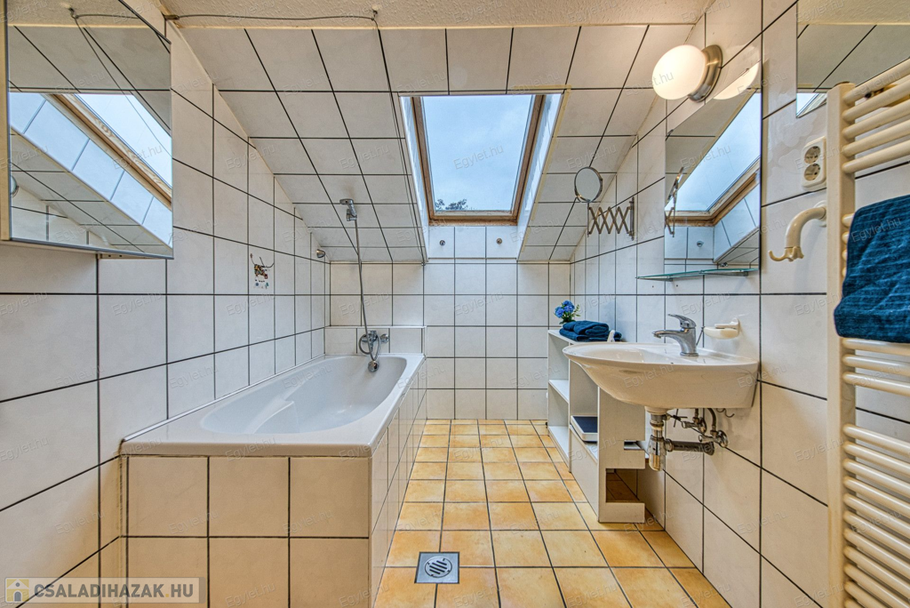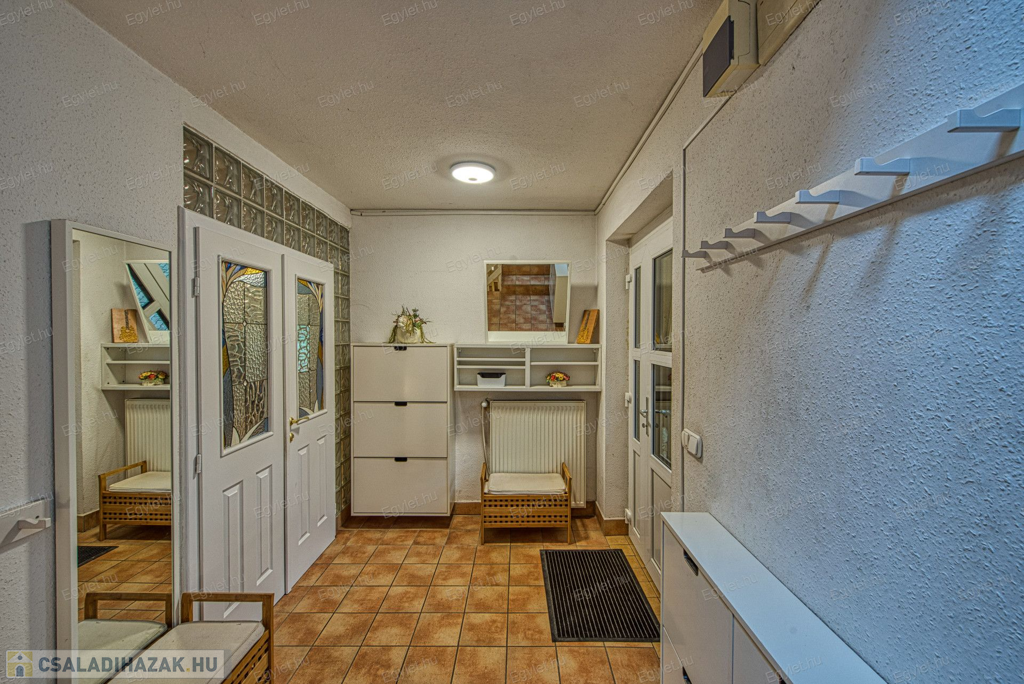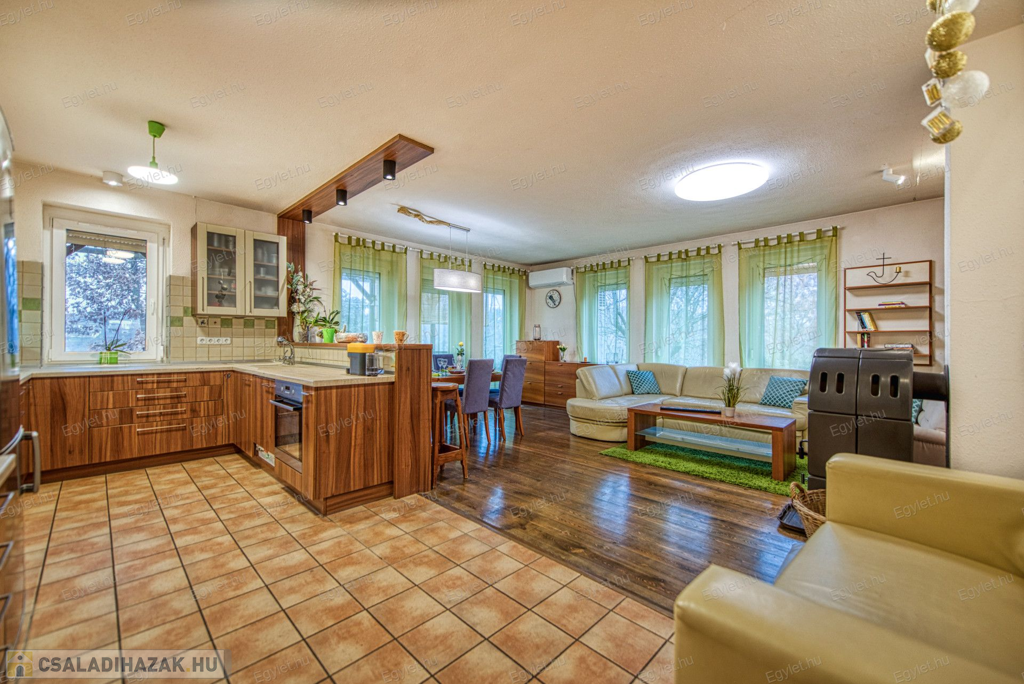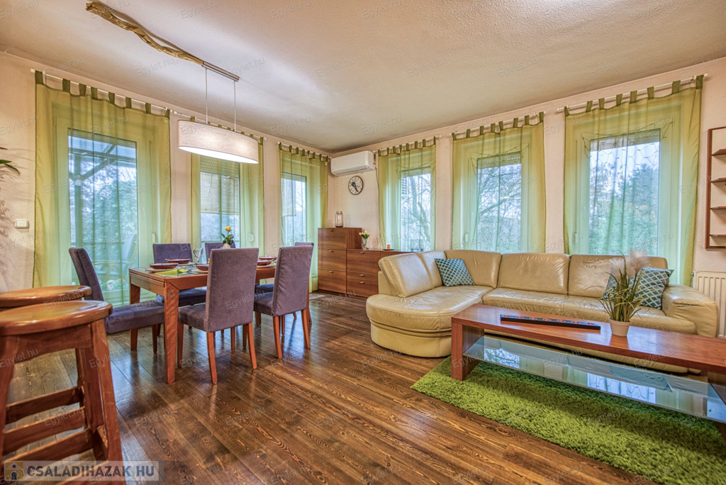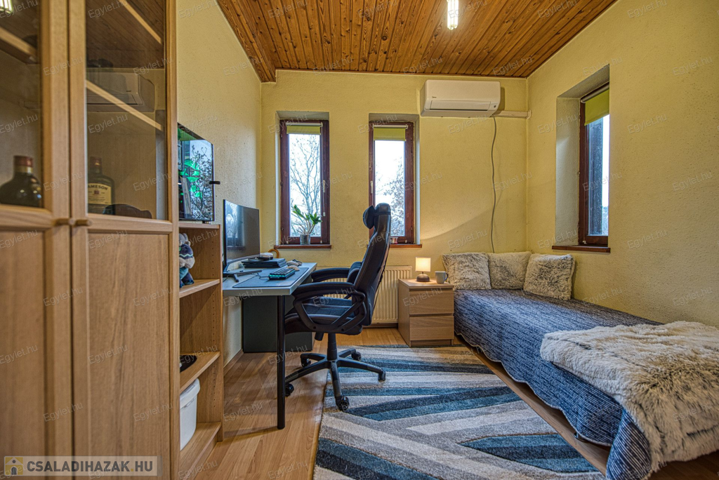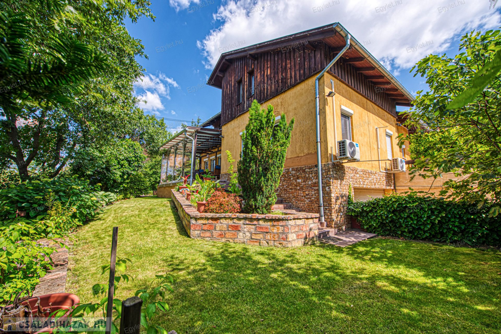 Eladó Érd egyik közkedvelt részén Érdligeten egy bruttó 250 nm-es 3 szintes 4+2 félszobás családi ház. Az összközműves 1205 nm-es telken két családi ház is található használati megosztással elszeparálva, ami a jogutódokra is kihat ezáltal a bankok teljes mértékben meghitelezik a vásárlást. A térképvázlaton eladó házként jelölt A+ -os energetikai besorolású ingatlan 2004-ben épült 38 cm vastag porotherm téglából. A szintek között betonfödém található. A 3 rétegű műanyag nyílászárók, hang és hőszigetelő hatásúak, az alsó szinten redőnnyel és szúnyoghálóval vannak ellátva. Köszönhetően a zsindelytetőre újonnan felszerelt napelemeknek az áram felhasználás költsége nullázódott és még 10 évig szaldós elszámolás érvényes rá. A használati melegvizet és a fűtést a vadonatúj kombi kazán biztosítja, de minden szobában található egy inverteres hűtő-fűtő klíma, illetve harmadlagos fűtésként mindkét szinten elhelyezésre került egy-egy fatüzelésű kályha. A két szint egy elkülönített lépcsőházból közelíthető meg így akár két generáció összeköltözésére is alkalmas az ingatlan. Mindkét emeleten található egy-egy terasz. Az első szinten egy panorámás 13 nm-es míg a földszinten egy téliesíthető 30 nm-es. Az 55 nm-es pinceszinten található a kazánhelyiség és a két férőhelyes garázs, ami az utcáról egy elektromos kapun keresztül is megközelíthető.Az igényes kertben automata öntöző rendszer került kialakításra. A környék nyugodt, csendes, természetközeli, az ingatlan egy hegyoldalon helyezkedik el. A közlekedést tekintve a vasútállomás 2 km-re található míg az M0-ás autópálya 5 perc gépkocsi távolságra. A két szint egy teljeskörű elszeparálás után akár külön is értékesíthető így kifejezetten ajánljuk befektetők figyelmébe is.Az ingatlan jogilag rendezett, az újonnan felszerelt napelemek és a 6 db hűtő-fűtő klíma miatt akár a kedvezményes zöldhitel is igénybevehető vásárlásnál. Amennyiben felkeltettem érdeklődését kérem, keressen fel bizalommal akár hétvégén is.