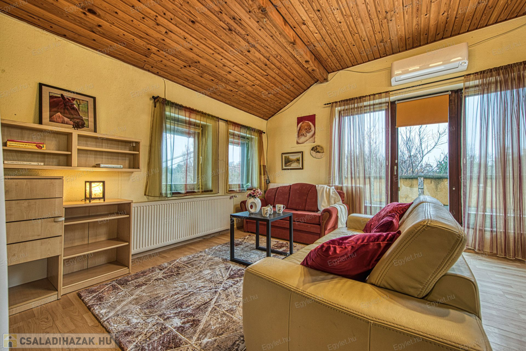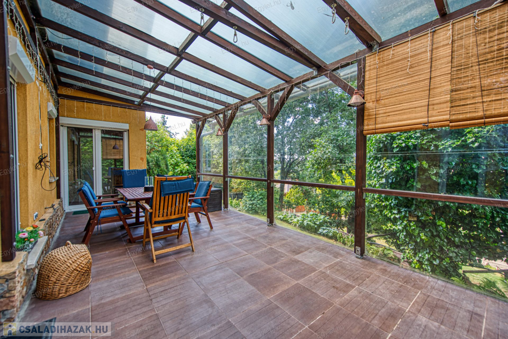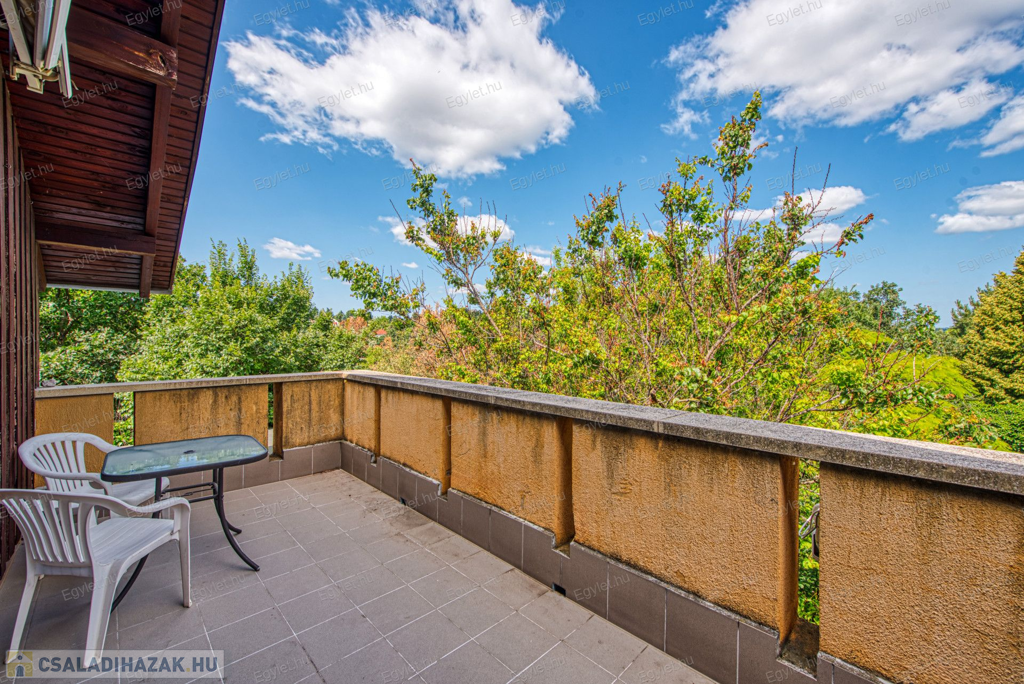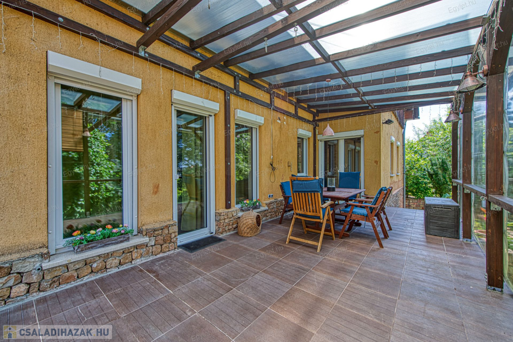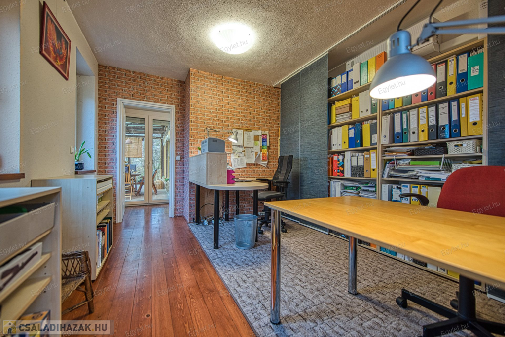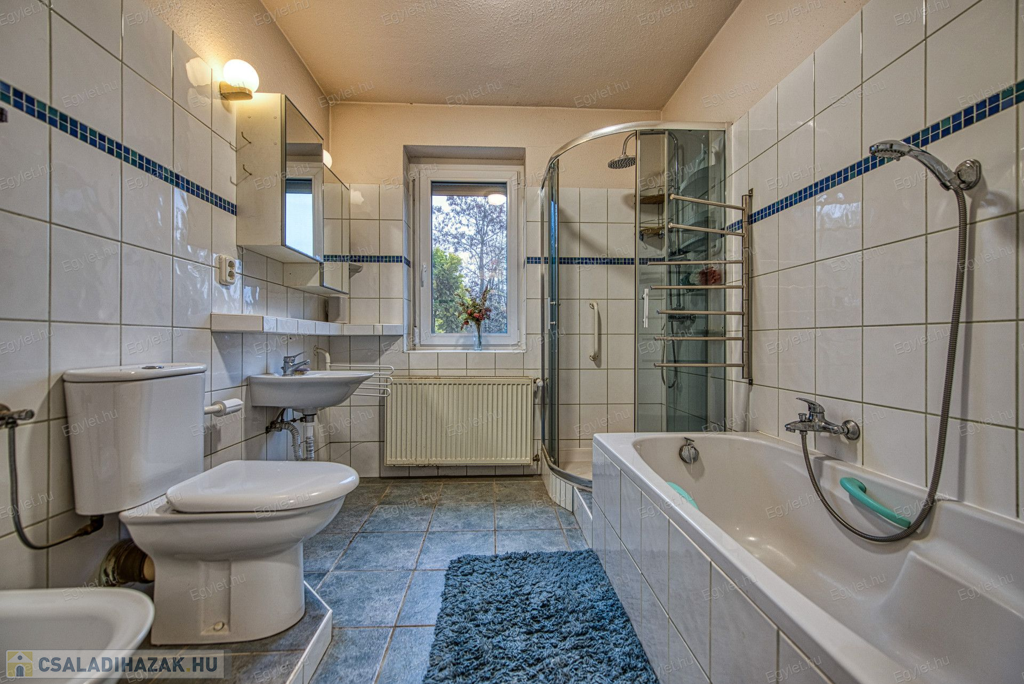 Eladó Érd egyik közkedvelt részén Érdligeten egy bruttó 250 nm-es 3 szintes 4+2 félszobás családi ház. Az összközműves 1205 nm-es telken két családi ház is található használati megosztással elszeparálva, ami a jogutódokra is kihat ezáltal a bankok teljes mértékben meghitelezik a vásárlást. A térképvázlaton eladó házként jelölt A+ -os energetikai besorolású ingatlan 2004-ben épült 38 cm vastag porotherm téglából. A szintek között betonfödém található. A 3 rétegű műanyag nyílászárók, hang és hőszigetelő hatásúak, az alsó szinten redőnnyel és szúnyoghálóval vannak ellátva. Köszönhetően a zsindelytetőre újonnan felszerelt napelemeknek az áram felhasználás költsége nullázódott és még 10 évig szaldós elszámolás érvényes rá. A használati melegvizet és a fűtést a vadonatúj kombi kazán biztosítja, de minden szobában található egy inverteres hűtő-fűtő klíma, illetve harmadlagos fűtésként mindkét szinten elhelyezésre került egy-egy fatüzelésű kályha. A két szint egy elkülönített lépcsőházból közelíthető meg így akár két generáció összeköltözésére is alkalmas az ingatlan. Mindkét emeleten található egy-egy terasz. Az első szinten egy panorámás 13 nm-es míg a földszinten egy téliesíthető 30 nm-es. Az 55 nm-es pinceszinten található a kazánhelyiség és a két férőhelyes garázs, ami az utcáról egy elektromos kapun keresztül is megközelíthető.Az igényes kertben automata öntöző rendszer került kialakításra. A környék nyugodt, csendes, természetközeli, az ingatlan egy hegyoldalon helyezkedik el. A közlekedést tekintve a vasútállomás 2 km-re található míg az M0-ás autópálya 5 perc gépkocsi távolságra. A két szint egy teljeskörű elszeparálás után akár külön is értékesíthető így kifejezetten ajánljuk befektetők figyelmébe is.Az ingatlan jogilag rendezett, az újonnan felszerelt napelemek és a 6 db hűtő-fűtő klíma miatt akár a kedvezményes zöldhitel is igénybevehető vásárlásnál. Amennyiben felkeltettem érdeklődését kérem, keressen fel bizalommal akár hétvégén is.