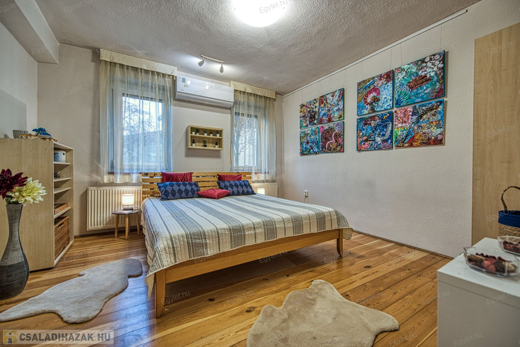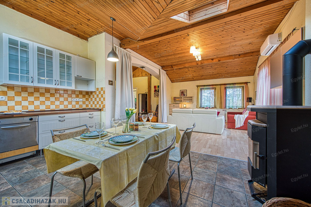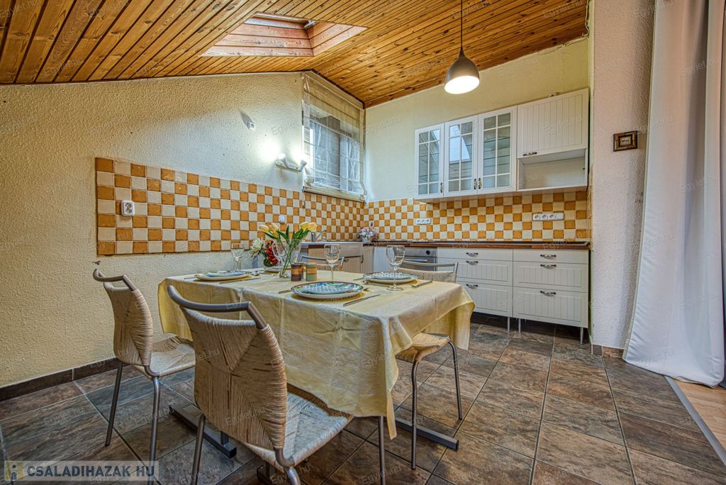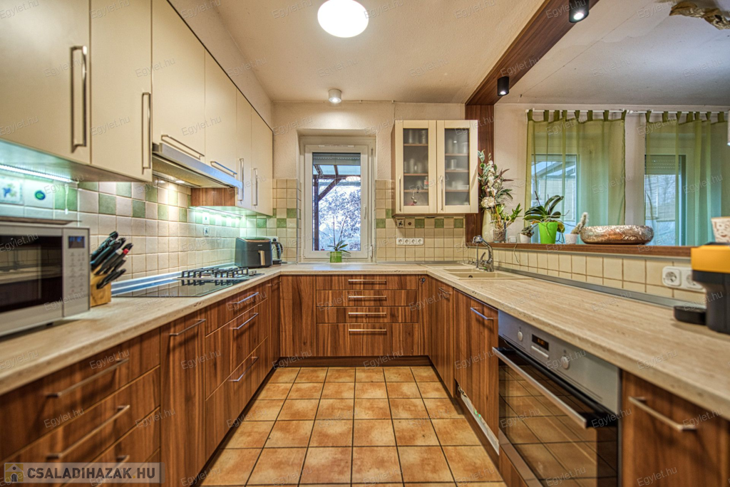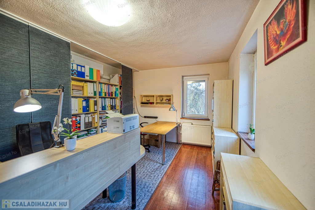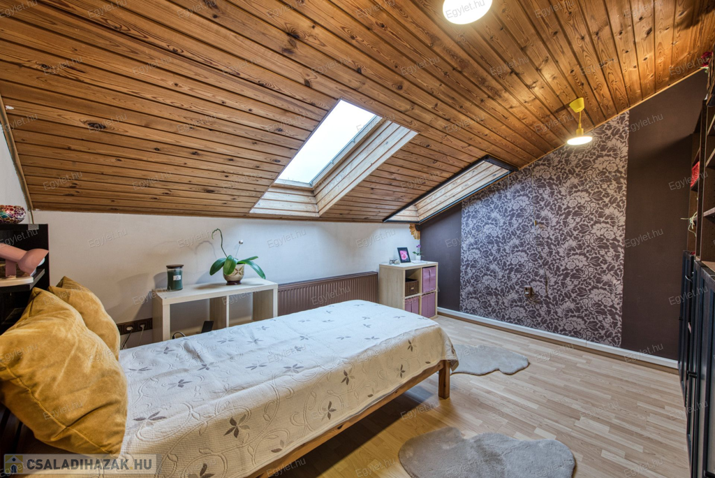 Eladó Érd egyik közkedvelt részén Érdligeten egy bruttó 250 nm-es 3 szintes 4+2 félszobás családi ház. Az összközműves 1205 nm-es telken két családi ház is található használati megosztással elszeparálva, ami a jogutódokra is kihat ezáltal a bankok teljes mértékben meghitelezik a vásárlást. A térképvázlaton eladó házként jelölt A+ -os energetikai besorolású ingatlan 2004-ben épült 38 cm vastag porotherm téglából. A szintek között betonfödém található. A 3 rétegű műanyag nyílászárók, hang és hőszigetelő hatásúak, az alsó szinten redőnnyel és szúnyoghálóval vannak ellátva. Köszönhetően a zsindelytetőre újonnan felszerelt napelemeknek az áram felhasználás költsége nullázódott és még 10 évig szaldós elszámolás érvényes rá. A használati melegvizet és a fűtést a vadonatúj kombi kazán biztosítja, de minden szobában található egy inverteres hűtő-fűtő klíma, illetve harmadlagos fűtésként mindkét szinten elhelyezésre került egy-egy fatüzelésű kályha. A két szint egy elkülönített lépcsőházból közelíthető meg így akár két generáció összeköltözésére is alkalmas az ingatlan. Mindkét emeleten található egy-egy terasz. Az első szinten egy panorámás 13 nm-es míg a földszinten egy téliesíthető 30 nm-es. Az 55 nm-es pinceszinten található a kazánhelyiség és a két férőhelyes garázs, ami az utcáról egy elektromos kapun keresztül is megközelíthető.Az igényes kertben automata öntöző rendszer került kialakításra. A környék nyugodt, csendes, természetközeli, az ingatlan egy hegyoldalon helyezkedik el. A közlekedést tekintve a vasútállomás 2 km-re található míg az M0-ás autópálya 5 perc gépkocsi távolságra. A két szint egy teljeskörű elszeparálás után akár külön is értékesíthető így kifejezetten ajánljuk befektetők figyelmébe is.Az ingatlan jogilag rendezett, az újonnan felszerelt napelemek és a 6 db hűtő-fűtő klíma miatt akár a kedvezményes zöldhitel is igénybevehető vásárlásnál. Amennyiben felkeltettem érdeklődését kérem, keressen fel bizalommal akár hétvégén is.