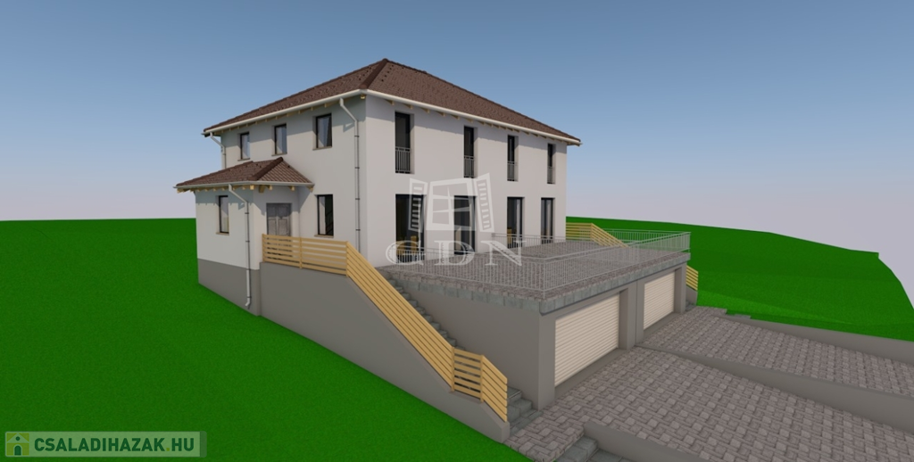 A házhoz tartozik egy 41 négyzetméteres terasz is, tökéletes hely a kikapcsolódásra és a családi összejövetelekre. A terasz a felső szinten található, hiszen ahogy a látványterveken is látható, a garázs tetejére került kialakításra.