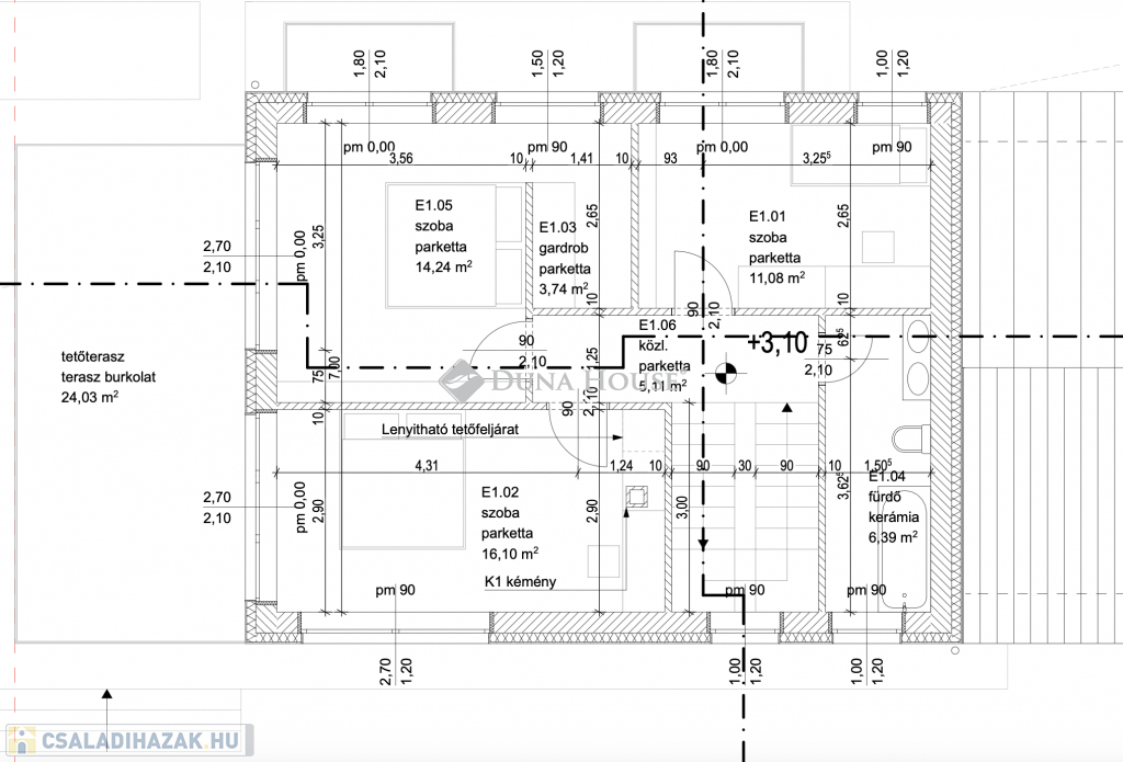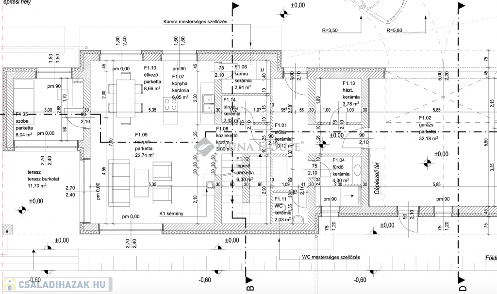 Műszaki adatok:- 30-as Leier tégla, 10 cm válaszfalak- 15 cm homlokzati szigetelés- Hőszivattyú 200 literes használati meleg víz tartállyal- H- tarifás mérőszekrény kialakítás