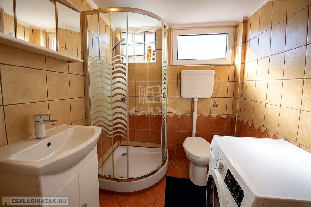 Az előkertben található egy zárt, könnyűszerkezetes GARÁZS, melyben kényelmesen elfér egy nagy autó és még bőven marad hely tárolásra is. További két autóval a telek előtt lehet parkolni.