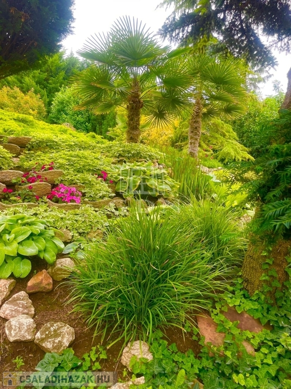 A parkosított kertben automata locsolórendszer és medence található – igazi kertvárosi oázis érett növényállománnyal.