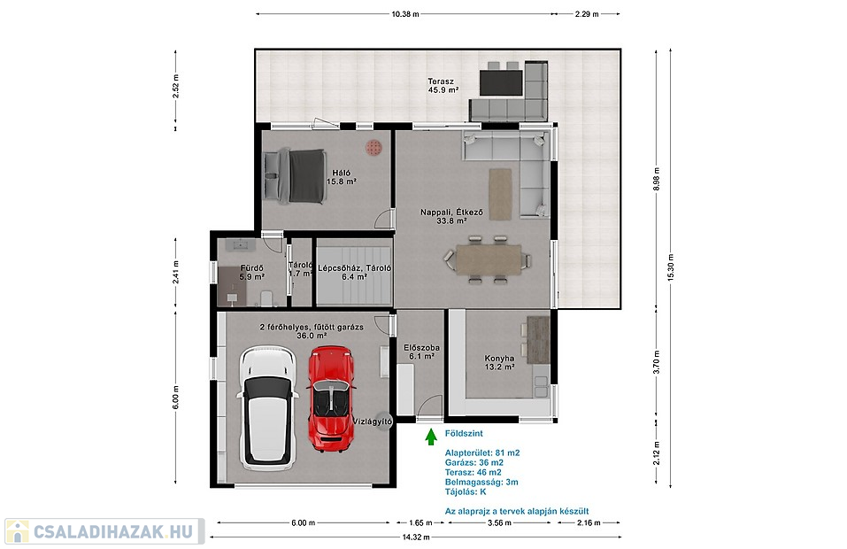 A 6x 6 méteres garázs két autó számára kényelmesen parkolható, továbbá extra tárolási helyet biztosít a teljes hosszában plafonig beépített polcrendszer.