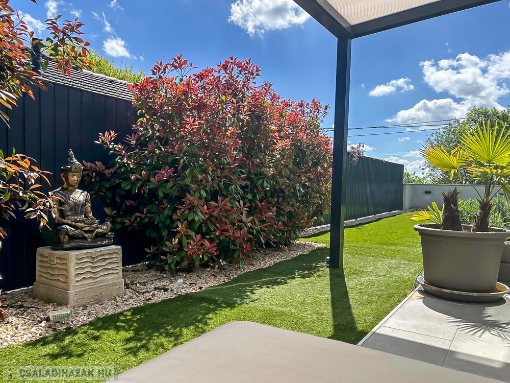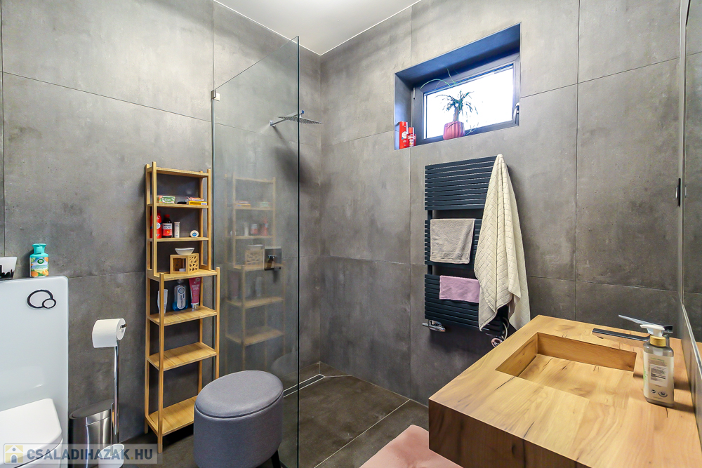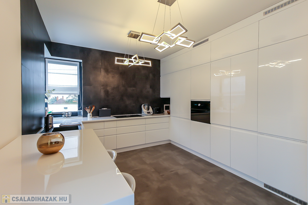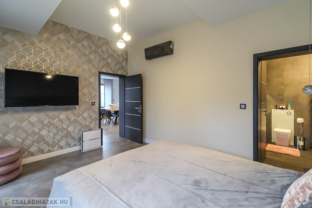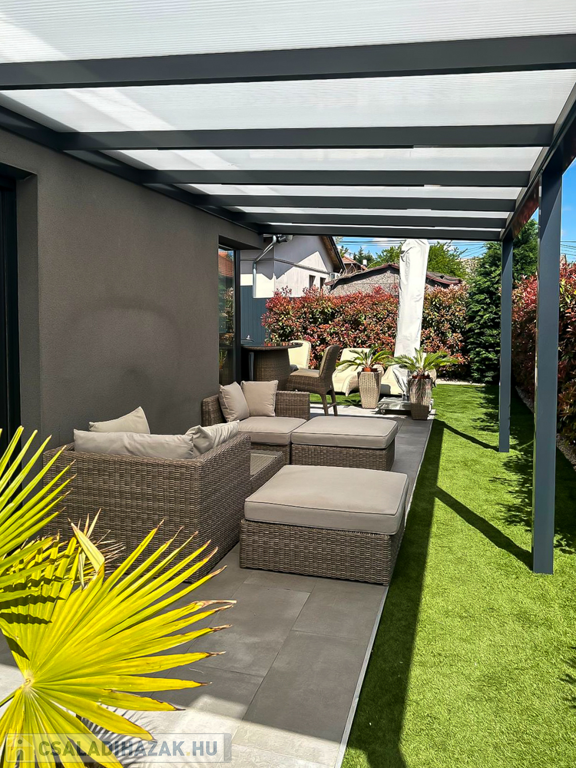 A modern stílusú családi ház 2020– ban épült egy 537 m2-es telekre, melyet mára már szépen megnőtt bokrok, dísznövények tarkítanak. A kertet csepegtetőrendszer tartja frissen.