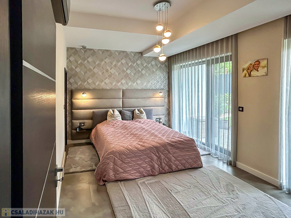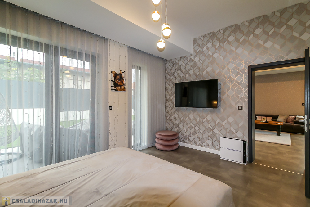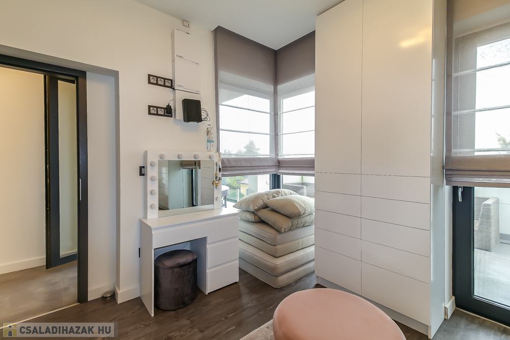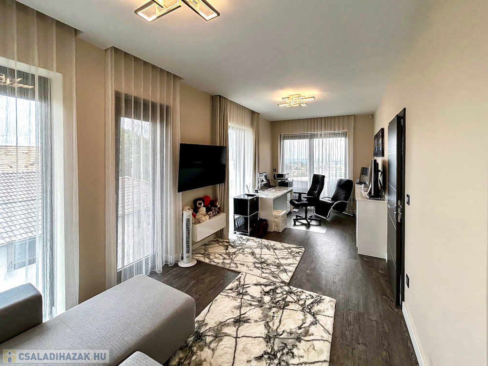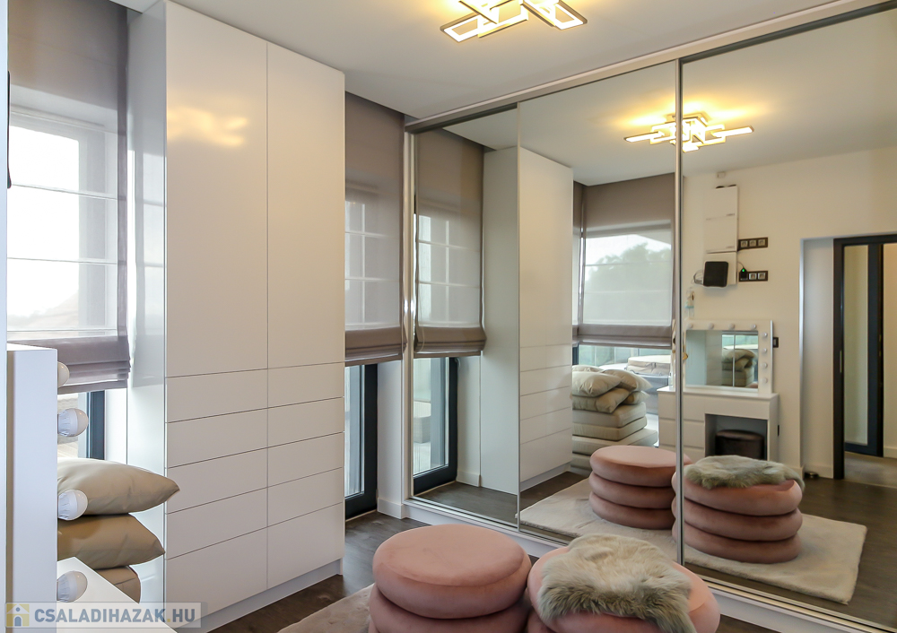 Nyílászárói háromrétegű üvegezésüek és elektromos redőnnyel felszereltek. A kert és garázsbejáró elektromosan mozgatható, a személybejáró kamerás kaputelefonnal ellátott. A biztonság jegyében: a ház biztonsági ajtóval, riasztóval, kamrarendszerrel egyaránt felszerelt.