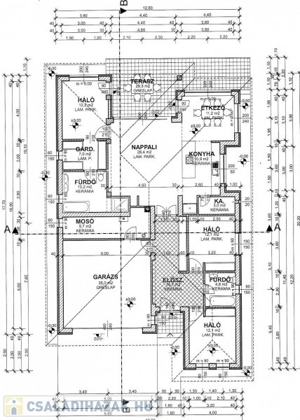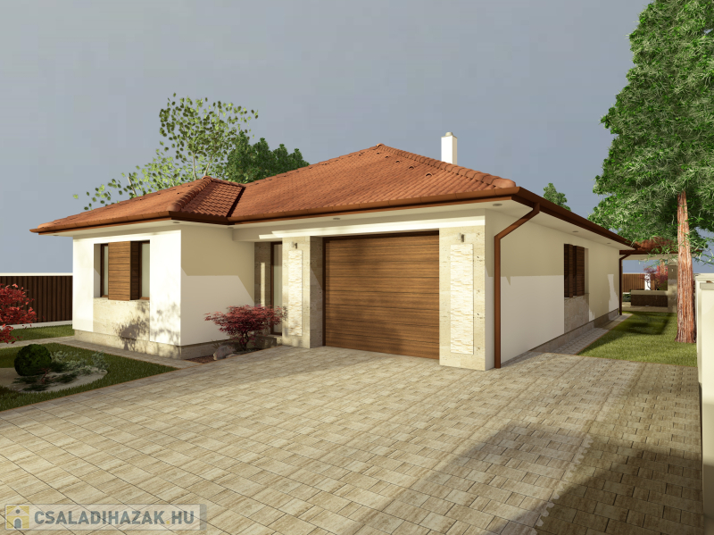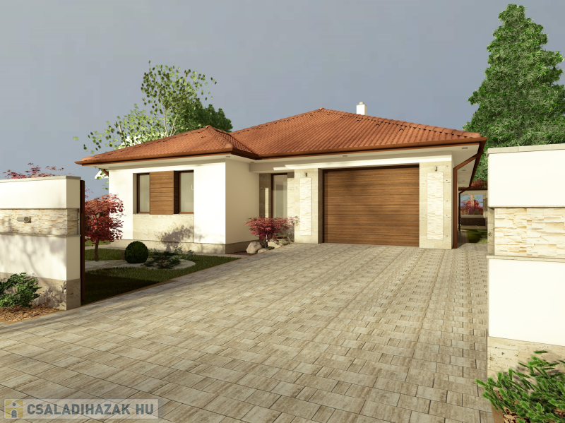 A ház helyiségei: 3 háló (12.2 m2, 12.1 m2, 12.1 m2) + nappali-konyha-étkező (50.5 m2) + 2 fürdő (10.2 m2, és 4.8 m2) + gardrob (7m2) + garázs (36 m2) +mosókonyha-kazánház (9.5m2 ) + gardrob (7 m2) , + közlekedő+gardrob (16.7m2)+ hátsó, kertkapcsolatos terasz (29.3 m2,ebből fedett kb 20 m2)