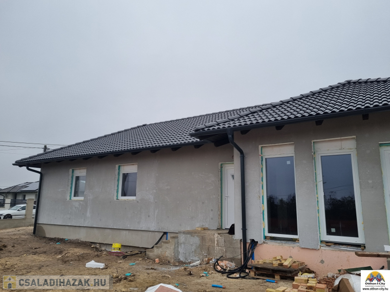 főfal: 30 cm tégla, 15 cm dryvit szigetelés, műanyag nyílászárók, fűtés: padlófűtés- hőszivattyú,