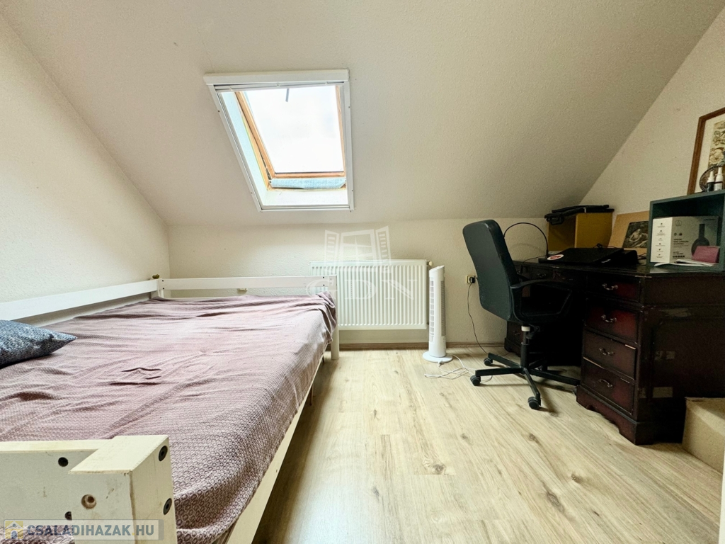 Érd kertvárosi környezetében, Tusculanum városrészben, csendes utcában, kertvárosi környezetben, 2016-ban épült, 2 lakásos ikerház jellegű házban, 300 nm-es önálló intim kerttel rendelkező, 1.emeleti, 102 nm-es hasznos lakóterületű, kiváló elosztású, nappali + 2 hálószobás, napos-világos D-K és D-NY-i fekvésű, alacsony fenntartású, kombinált gázcirkó fűtésű, jó állapotú, közvetlen kertkapcsolatos lakás, beépített, gépesített konyhával, telken belüli felszíni gépkocsi beállóval, rendezett kerttel eladó!