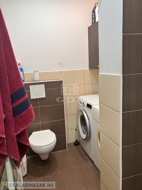 A fürdőszoba modern kialakítású, zuhanykabinnal, külön WC-vel, mosógép elhelyezési lehetőséggel.