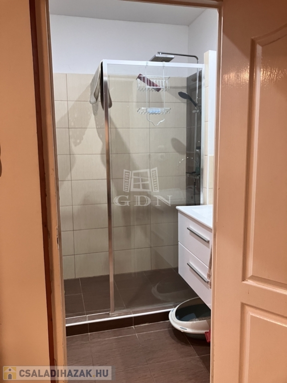 A fürdőszoba modern kialakítású, zuhanykabinnal, külön WC-vel, mosógép elhelyezési lehetőséggel.