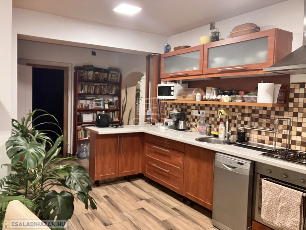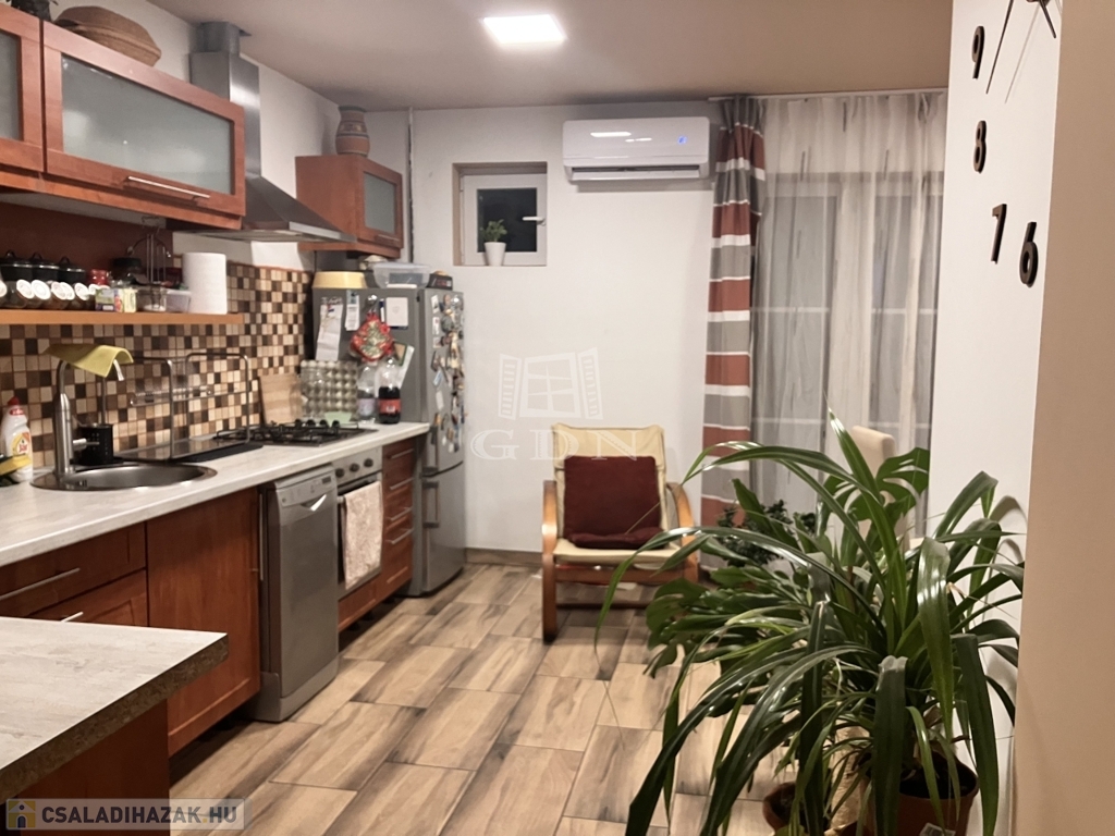 A ház alsó szintjén egy tágas, egyedi hangulatú konyha–étkező kapott helyet, beépített konyhabútorral és gépesítéssel, amely kényelmes teret biztosít a mindennapokhoz és a közös étkezésekhez.