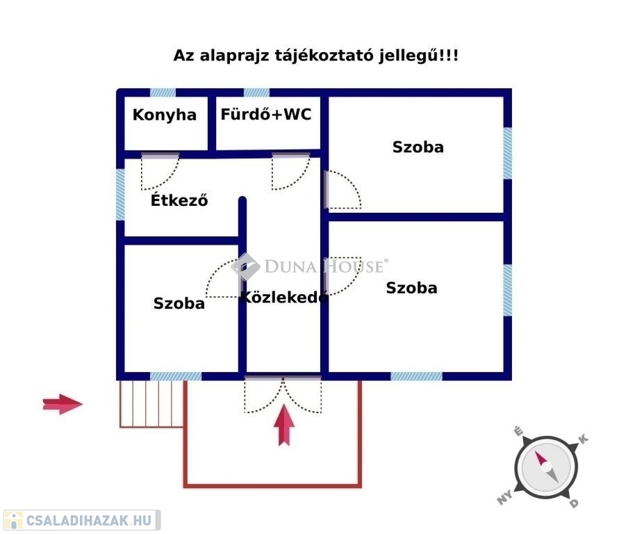Elrendezése: közlekedő, fürdőszoba+WC, 2 szoba, konyha, étkező, fedett teraszról jutunk az ingatlanba.