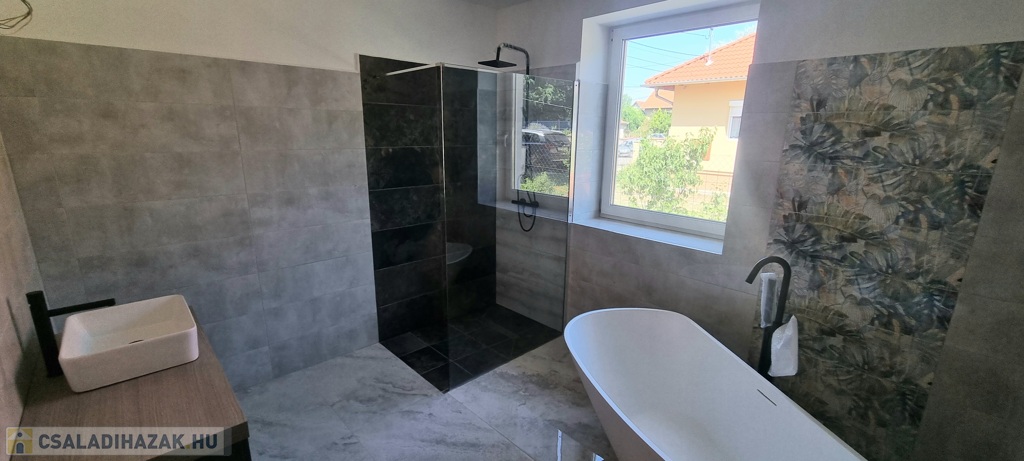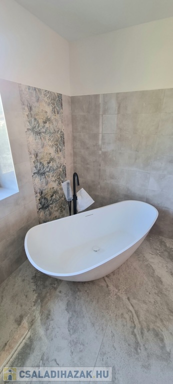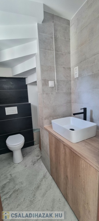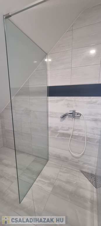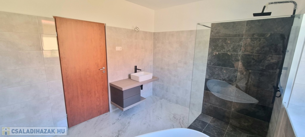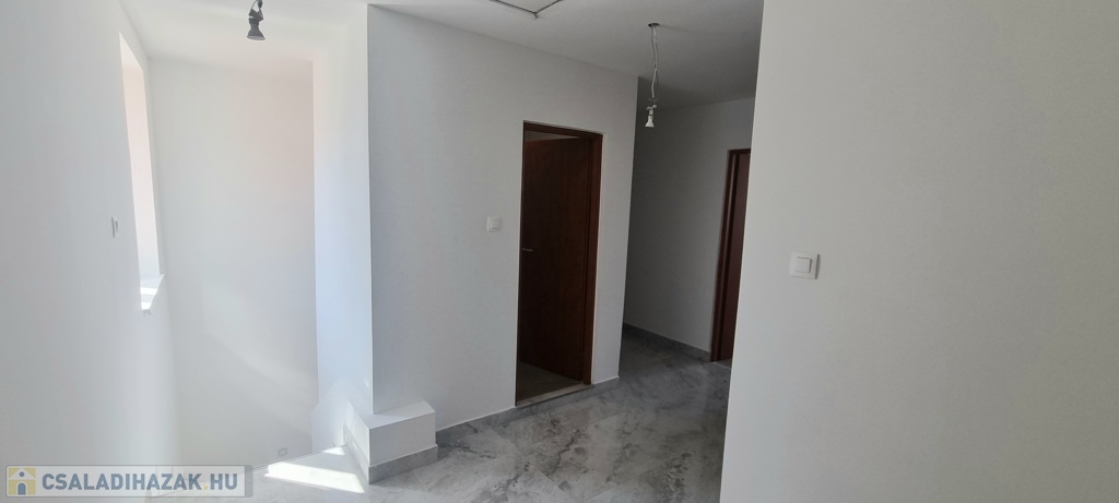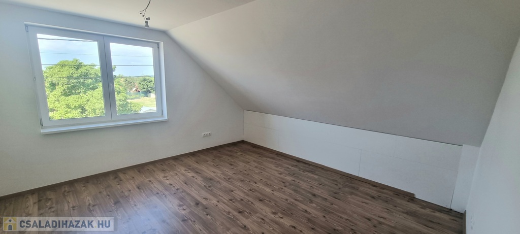 A felső szinten 2 hálószoba, tágas gardróbszoba, fürdőszoba épített zuhannyal és külön wc mosdóval található.