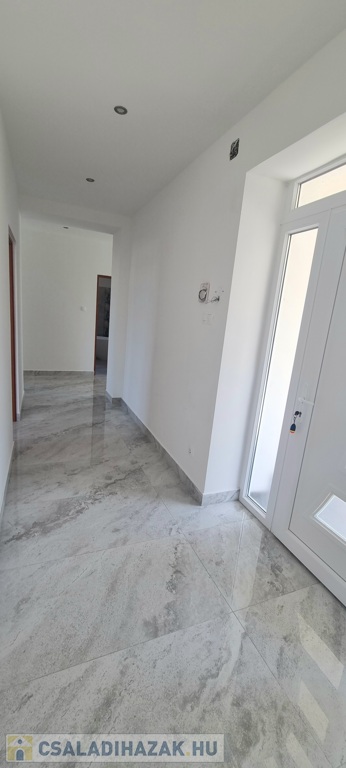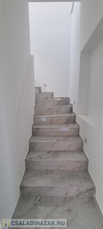 A nappaliban, a lépcsőházban és az emeleti közlekedőben egyező hidegburkolat, 8mm nagyméretű kerámia 120x60cm méretben. Szobákban laminált padló.