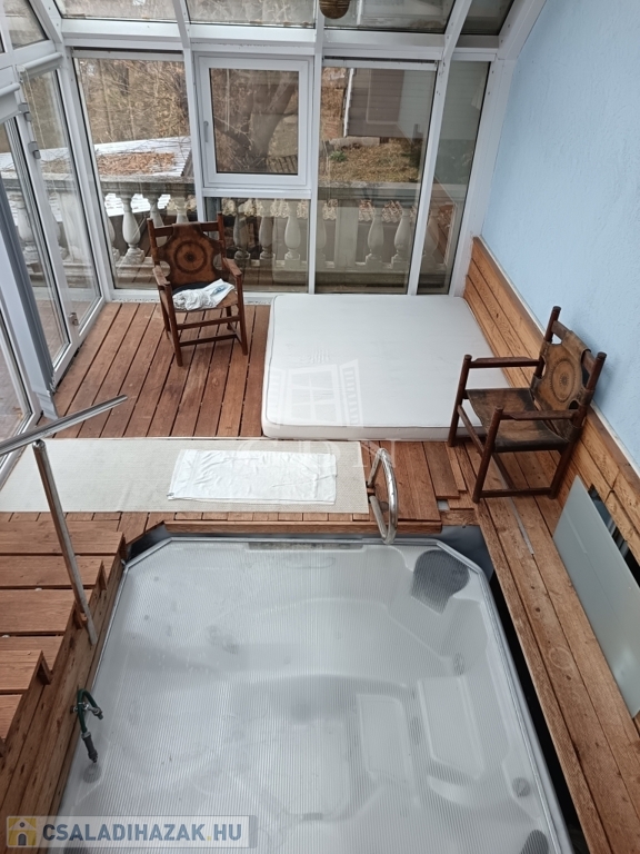 - földszint: előtér, szoba, második előtér, amelyből egy fürdőszoba és az amerikai konyhás nappali nyílik. A nappaliból ki lehet menni a beépített teraszra, téli kert hangulattal bír, fűthető tér, amelyen egy jakuzzi is elhelyezésre került.