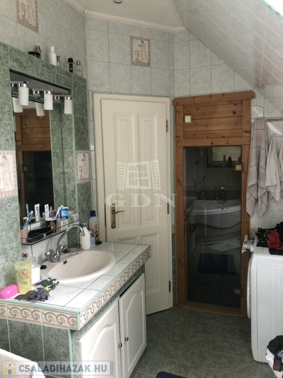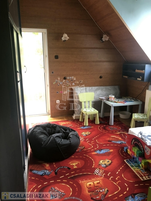 - beépített tetőtér, lényegében csak 2 lépcsőfokkal helyezkedik el magasabban a nappalinál, így majdhogynem egy teret alkotnak. Itt egy tágas előtérből közelíthetjük meg a 3 hálószobát, és egy fürdőszobát, amelyből egy szaunába jutunk el.
