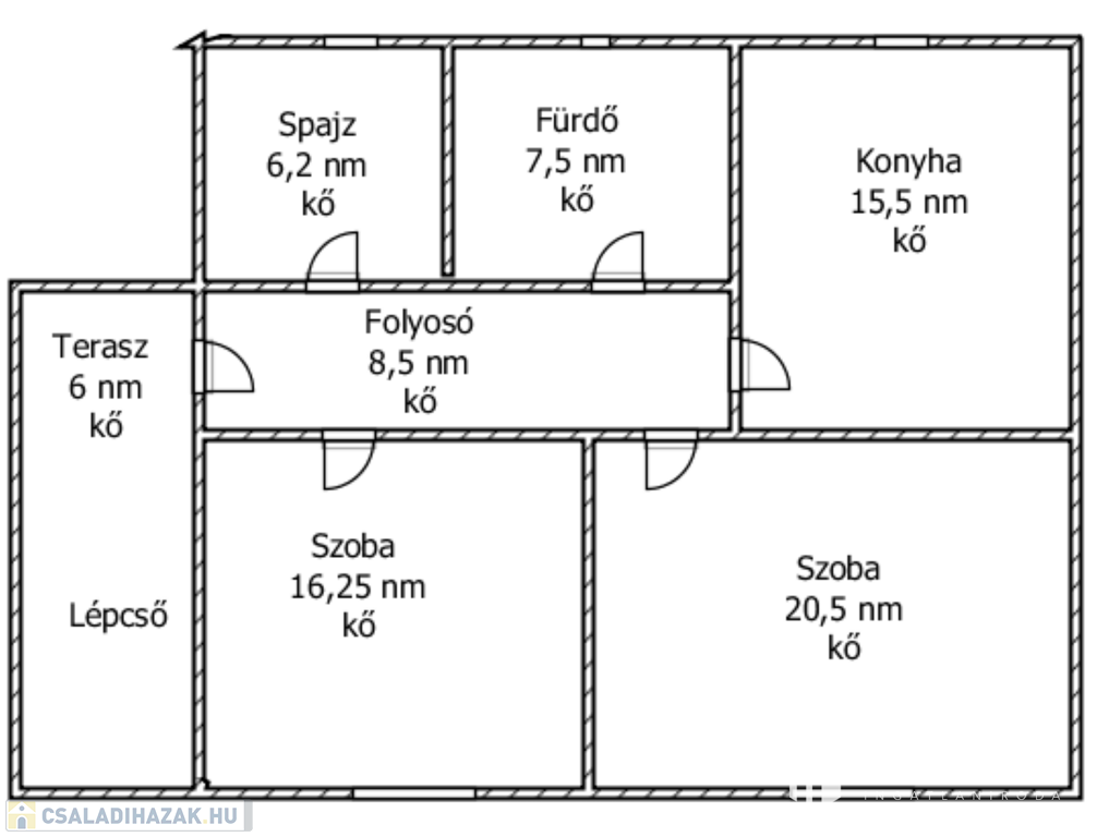 Az ingatlanban egy konyha, 2 szoba, fürdőszoba, kamra, és közlekedő található. A ház alápincézett, az ablakok redőnyözöttek.