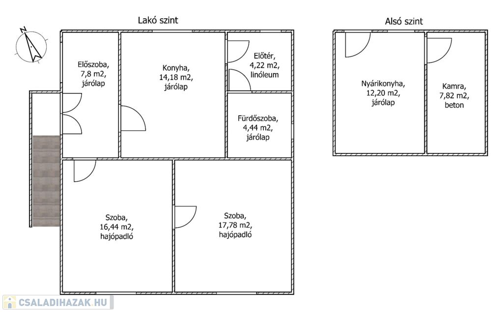 A felső szinten, előszoba, két nagy lakószoba, konyha, fürdőszoba van, az alsó szinten nyári konyha, és egy nagy tároló helyiség található, valamint egy kisebb melléképület.