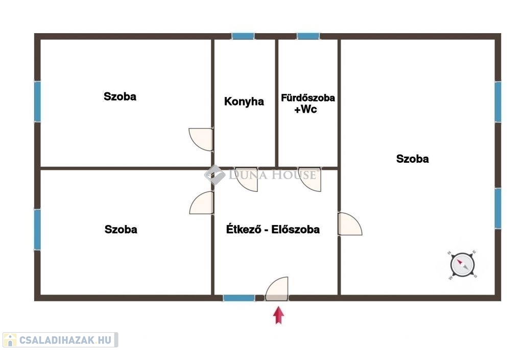 Az ingatlanban 3 különnyíló szoba, egy akár nappalinak is használható étkező, egy konyha, és egy fürdőszoba+wc helyiségek kaptak helyet. A helyiségek mindegyike ablakos, így a ház fényviszonya, és szellőztethetősége is kitűnő.