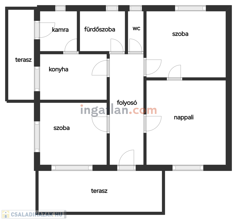 Az ingatlanban 3 szoba, konyha, kamra, és külön fürdőszoba- wc található. A szobák különállóak, a folyósóról nyílnak.