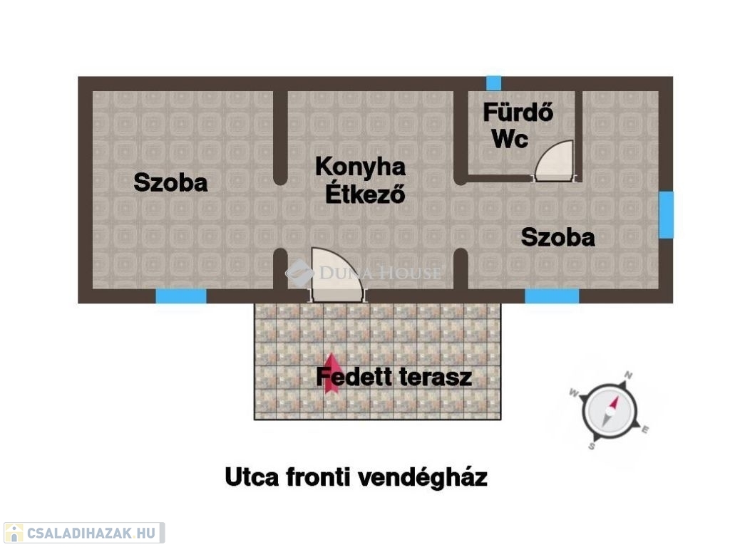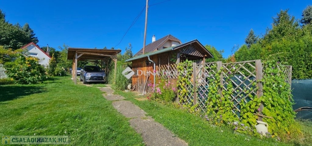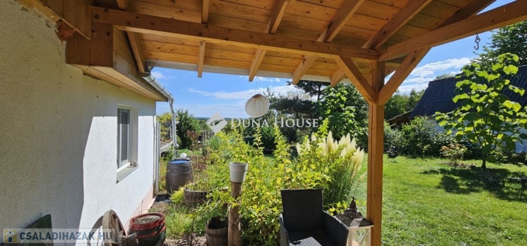 Az utcafrontról dupla kapu biztosítja a gépjárművel való behajtást, ahol a 2 szobás vendégházat találjuk, mely egy 10 m2-es fedett kiülővel rendelkezik. Emellett egy földbe süllyesztett kb 7 -8 m2 es borospince található. Ezek mellett több kerti tároló is elhelyezésre került.